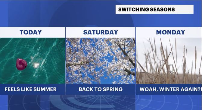 A cold front moves through late Friday, ushering in a cooler air mass. Weekend temperatures fall back into the upper 50s to low 60s under partly to mostly cloudy skies. Conditions will feel more typical for April, with a comfortable but noticeably cooler pattern settling in.