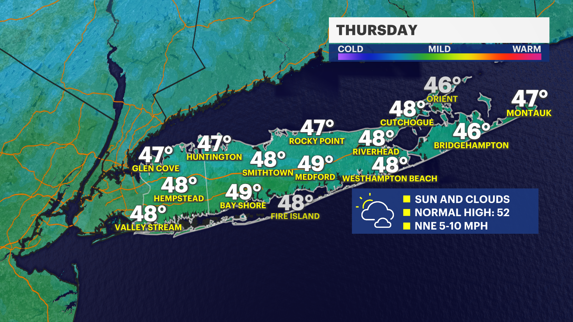Thursday: Partly sunny, with a high near 51. Northeast wind 5 to 10 mph.