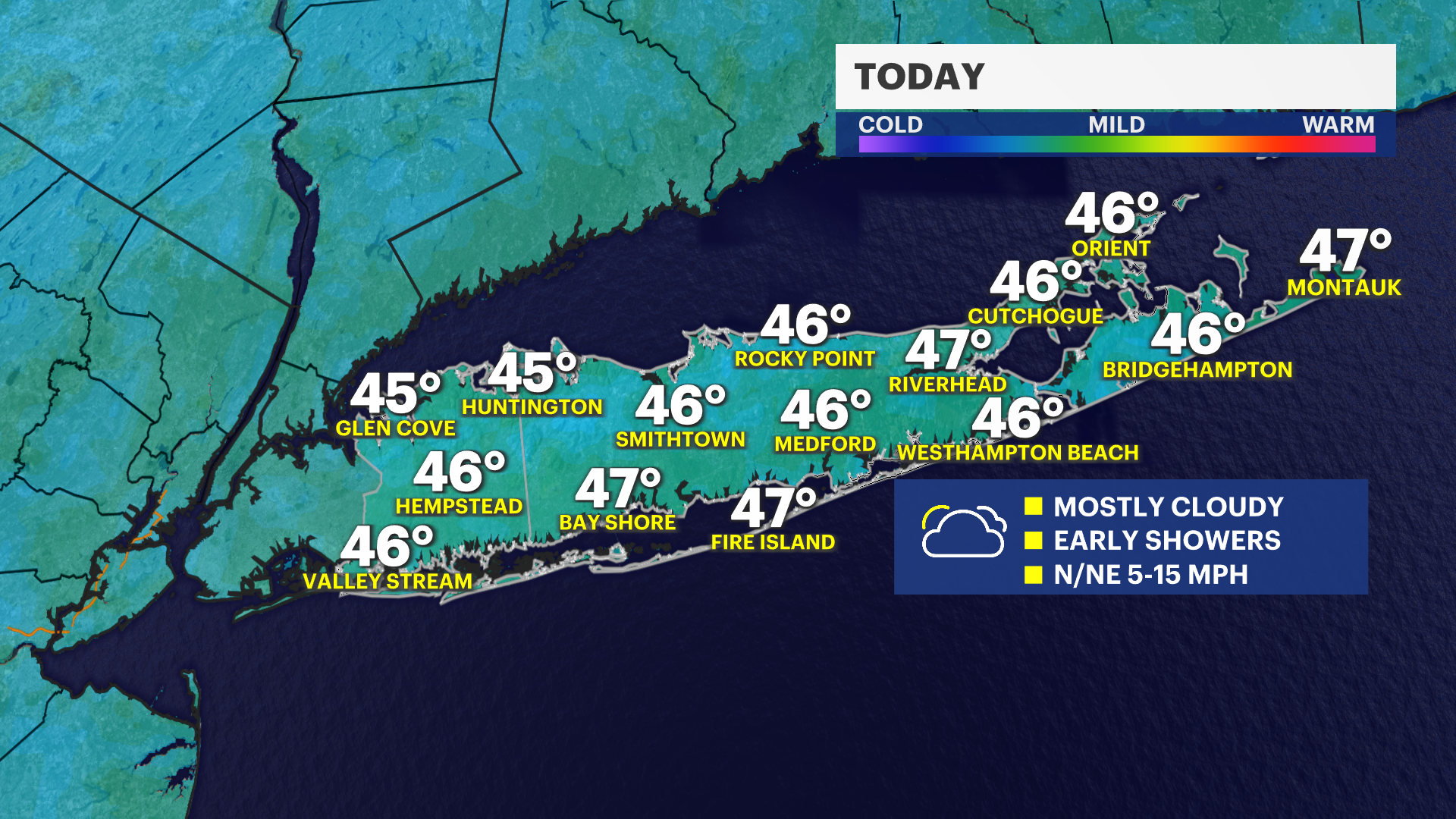 Mostly cloudy this afternoon with some sunny breaks. Highs 46 to 69. Winds North-Northeast 5 to 10 mph.