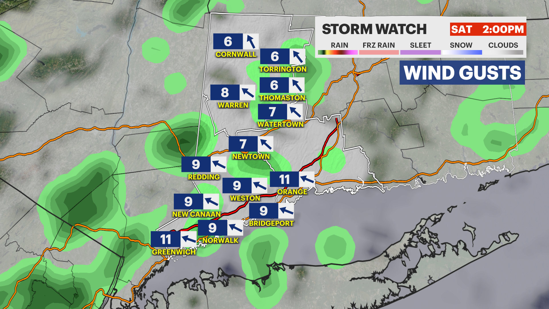Coastal Flooding: The threat for coastal flooding exists because of the easterly flow of wind. High tide will be 1-2 feet higher than usual with the biggest impacts in coastal Fairfield County.