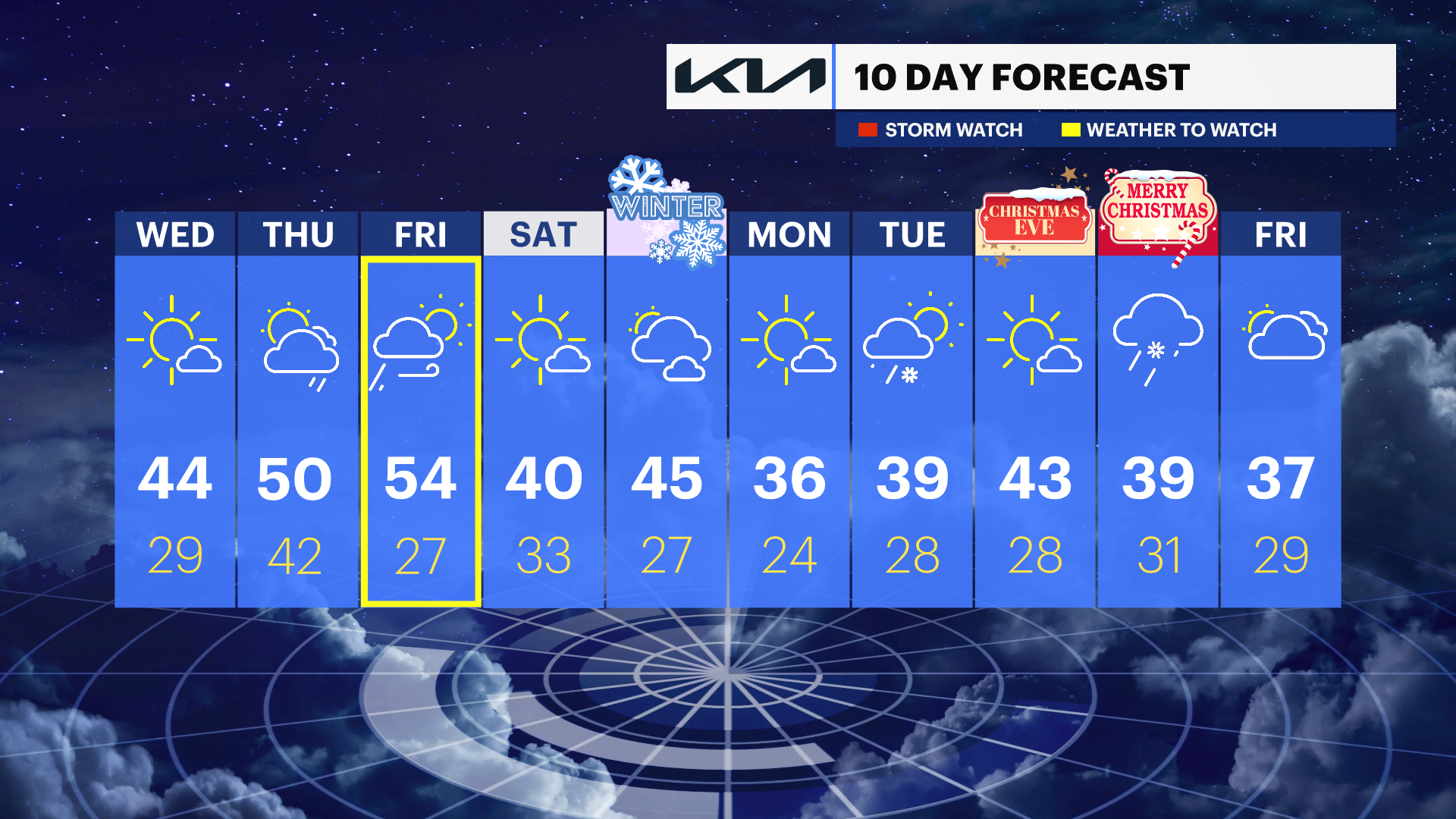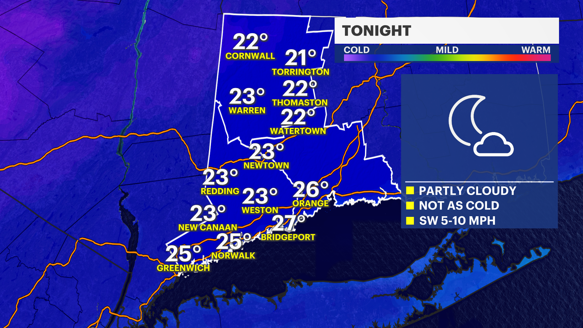 TONIGHT: Partly cloudy then clear and cold. Low of 27.