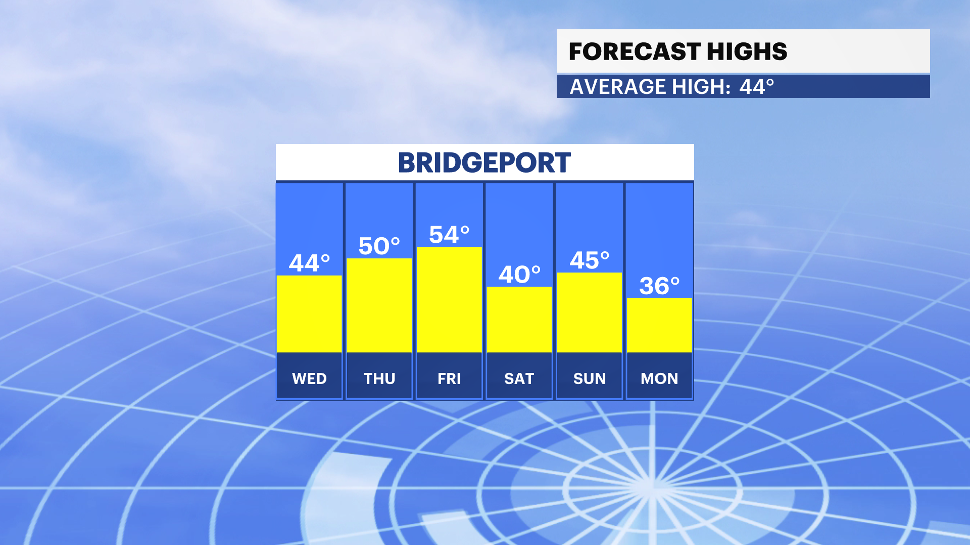 CLIMATE: Bridgeport, CT normal temperatures: 45/30