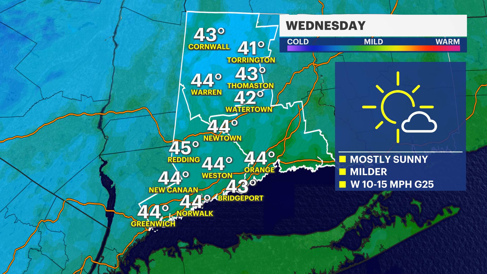 WEDNESDAY: Mostly sunny and breezy. Milder. High of 44.