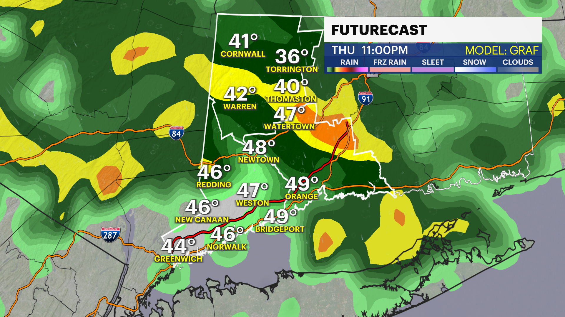 THURSDAY: Mostly cloudy. Late rain showers. High of 49.