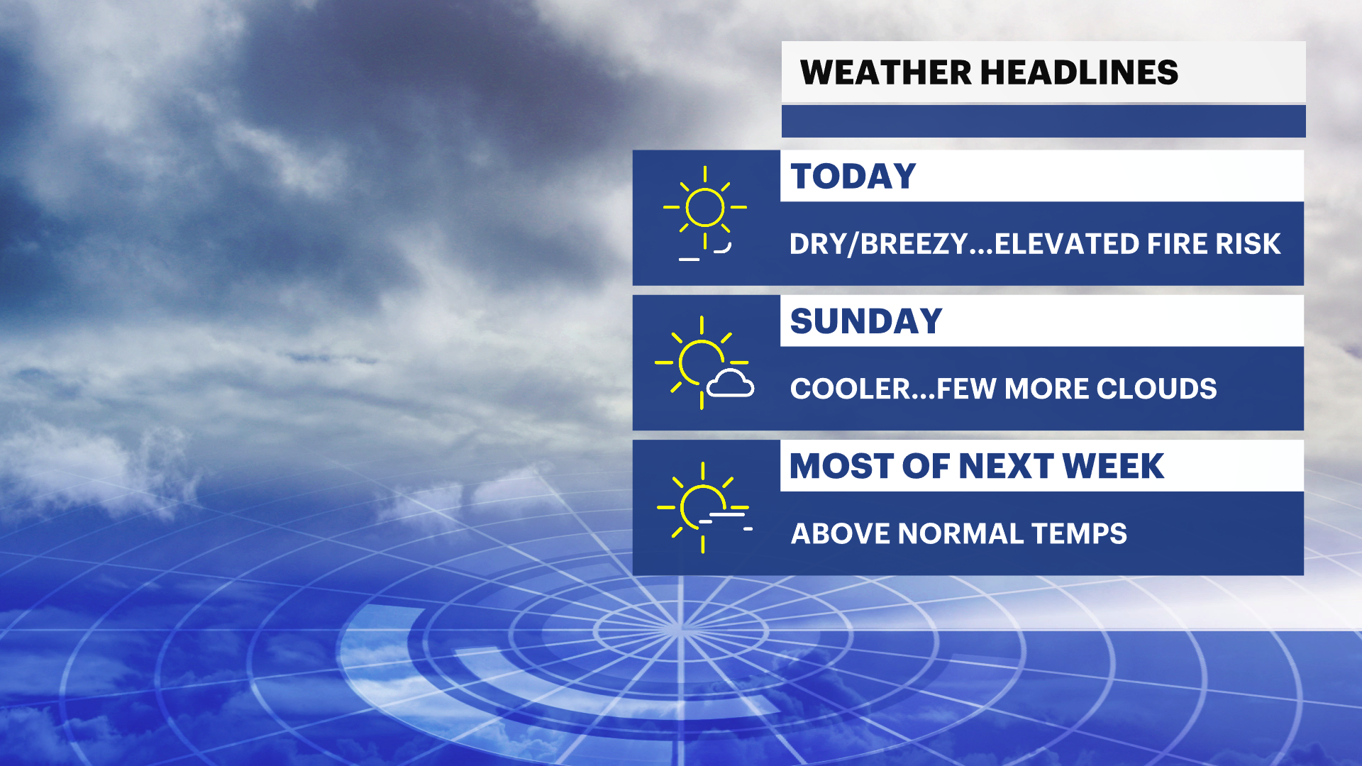 Today: A cold front slips through early with no meaningful rain, and the rest of the day turns dry and breezy. Northwest winds will pick up, and highs will be around 60°—a bit cooler inland, slightly milder near the coast. With dry air, gusty winds, and dry ground, there’s an elevated risk for fires to start and spread, so be extra careful with anything that could spark a flame.