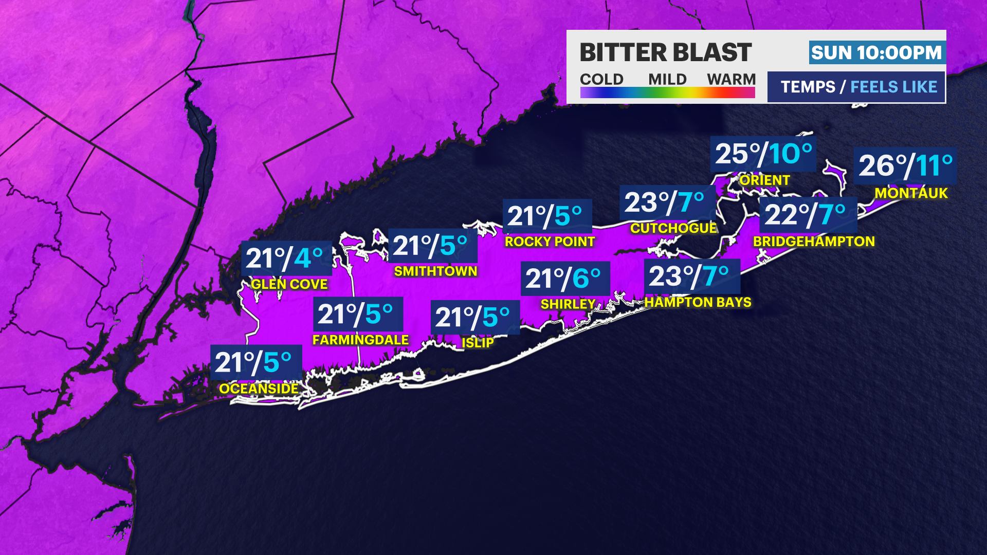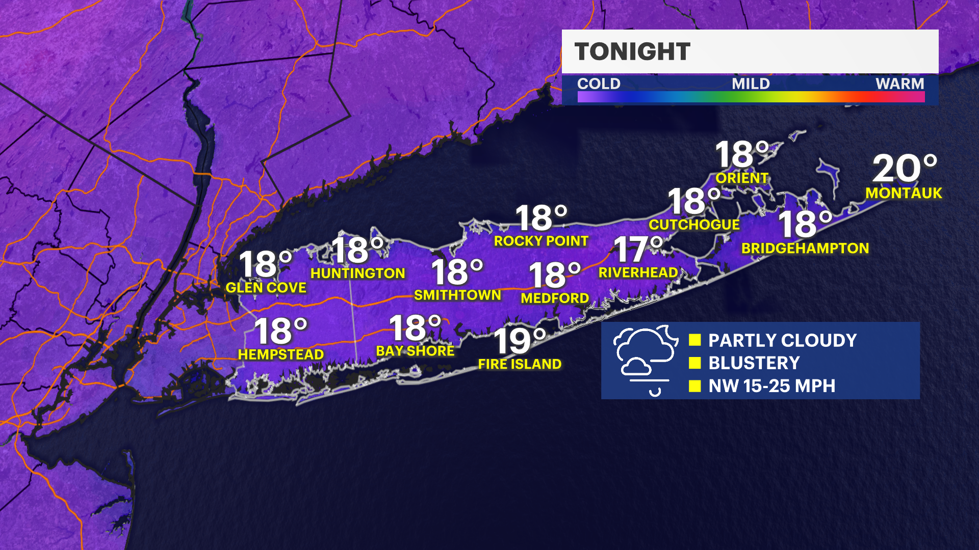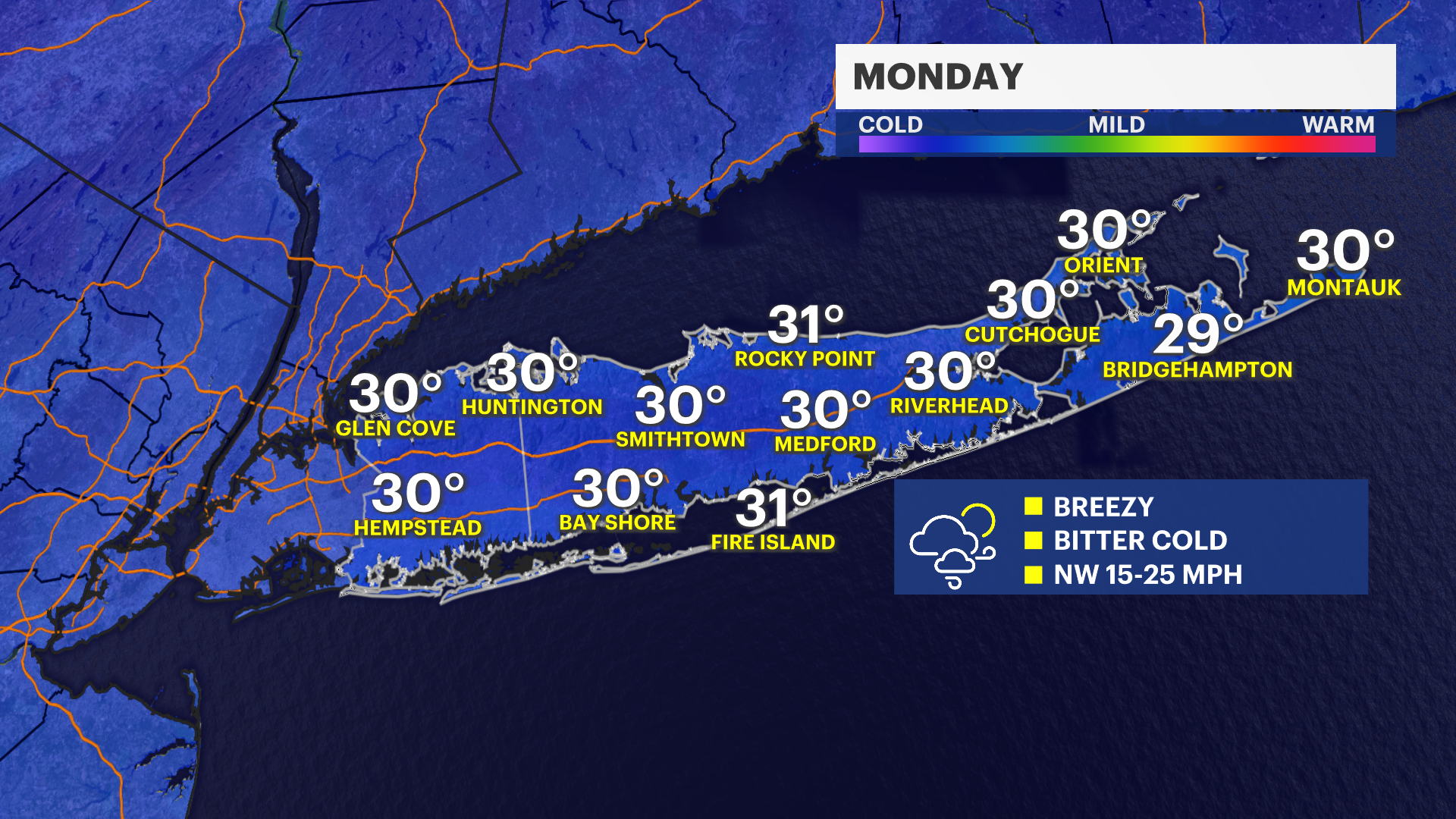 Arctic air rushes in overnight. Temperatures will drop into the mid teens across the island, perhaps colder in spots, with wind chills between 0F and 10F on Monday morning. Expect gusty winds up to 30 mph.
