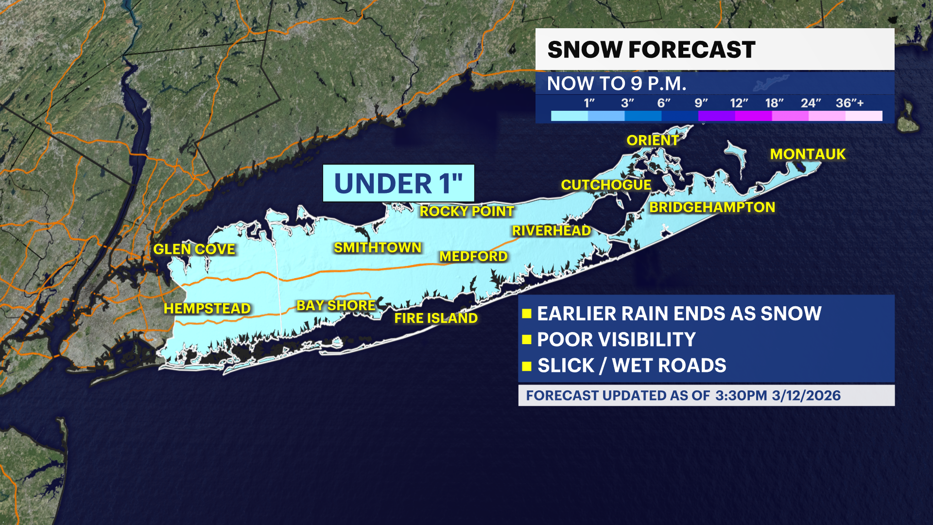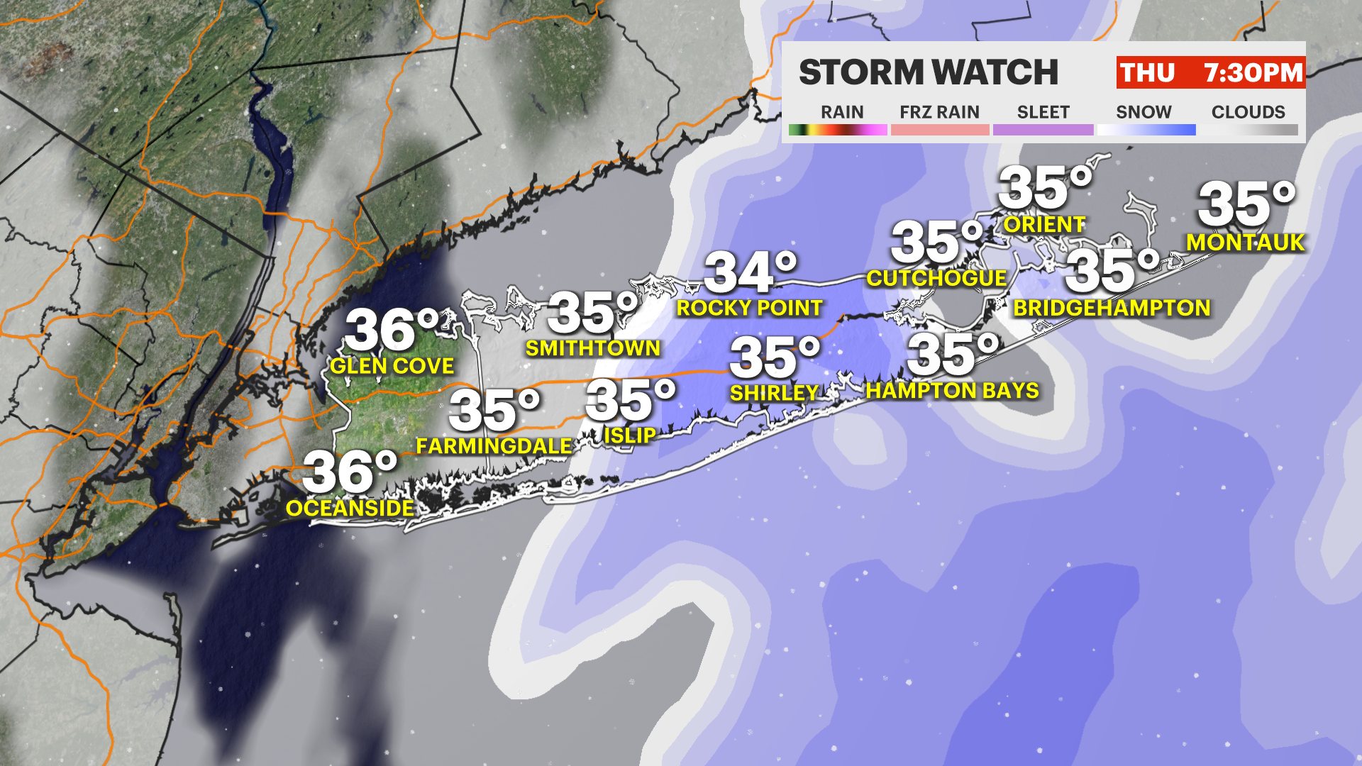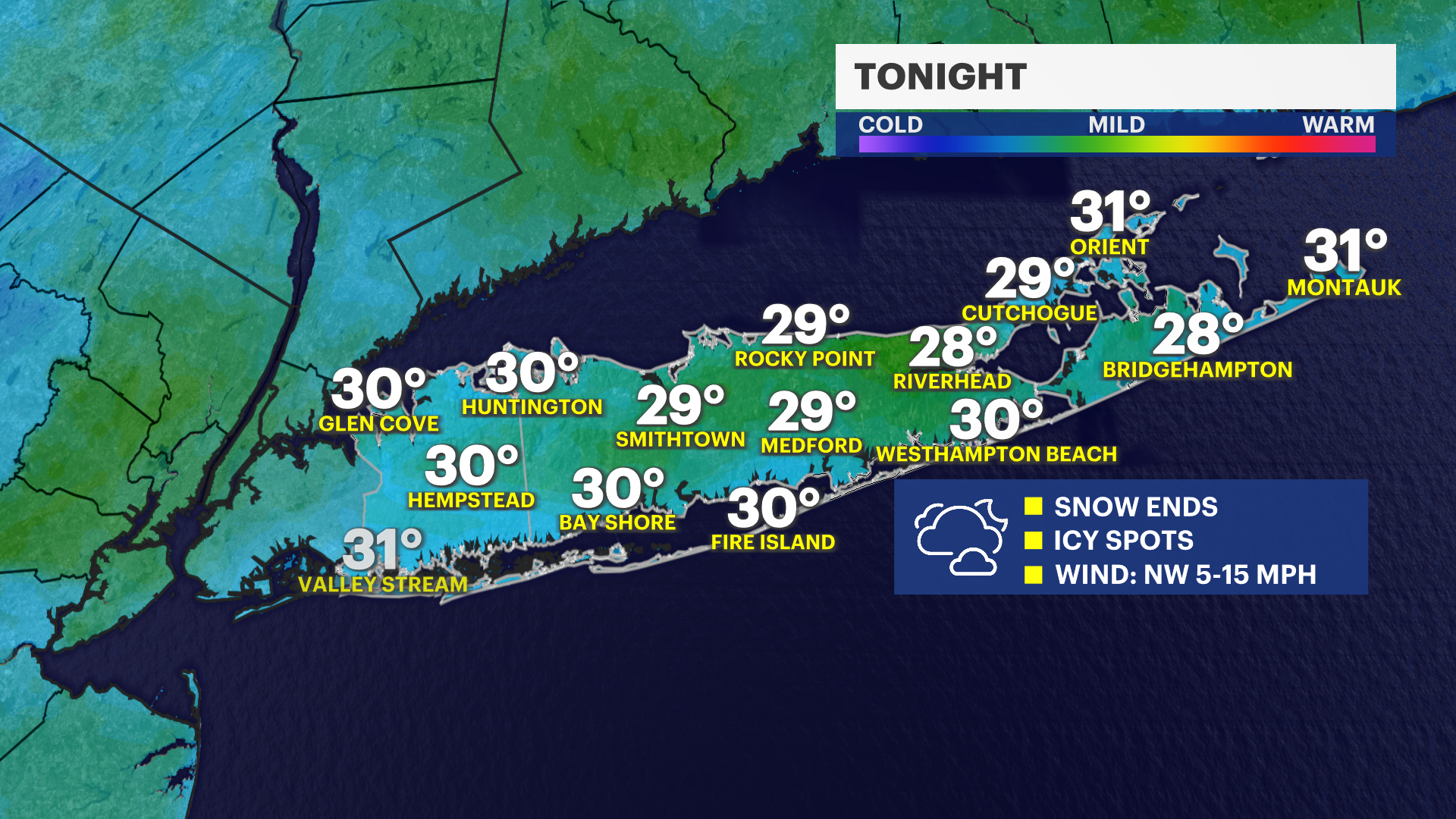Scattered rain showers are changing to a wintry mix and then snow from now and through 6 p.m. Once the changeover occurs near you, expect periods of snow showers with lower visibility through mid-evening. Snow showers will end by around 7 p.m. to 8 p.m. for much of Long Island.