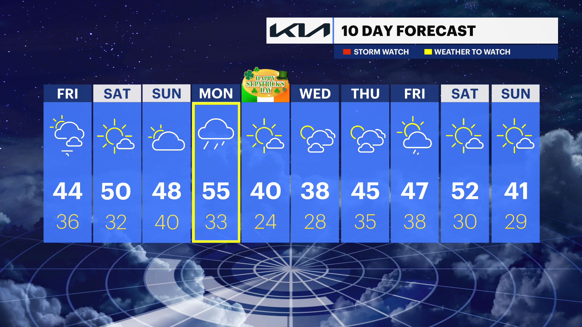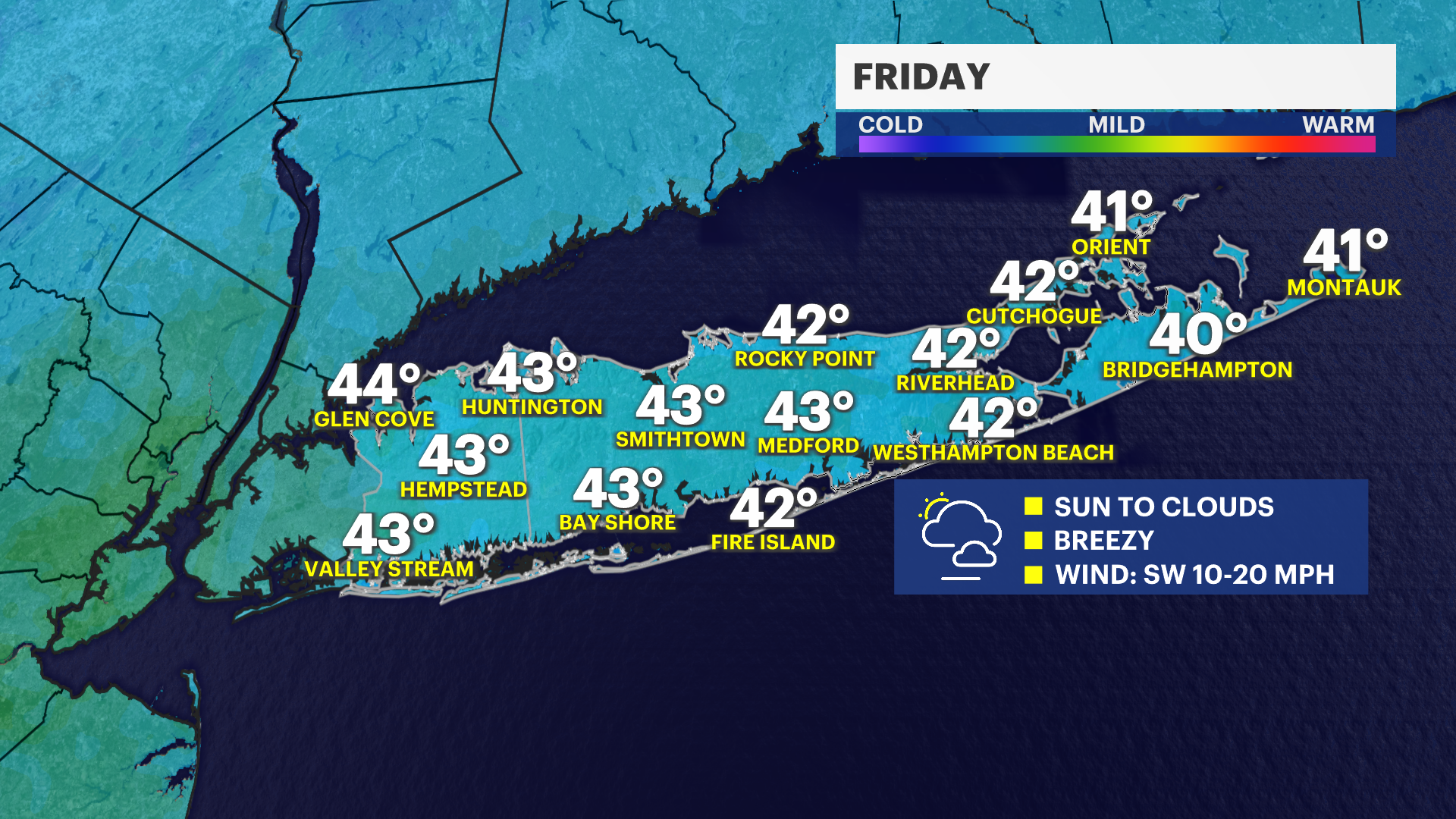 On Friday, expect a partly sunny day. Breezy, with a high temperature in the lower to middle 40s. As we head into the weekend, temperatures will return to the upper 40s to around 50 degrees with a mix of sun and clouds. Clouds will build on Sunday as our next storm approaches Long Island. Expect rain and gusty wind on Monday with highs in the 50s. Once the cold front passes on Monday night, skies will clear and sunny and chilly weather arrives for Saint Patrick's Day.