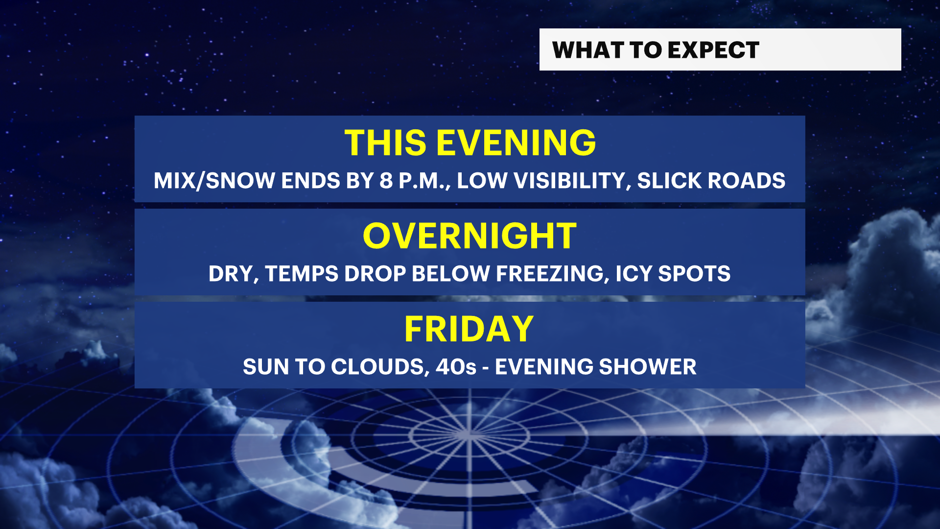 Tonight: Snow showers, possibly mixed with rain at times before 8 p.m. A coating of snow on colder surfaces. Otherwise, wet travel until temperatures drop below freezing after midnight. Lows around 29. Northwest wind 5 to 15 mph. New snow accumulation of less than half an inch is possible. Icy spots into Friday morning.