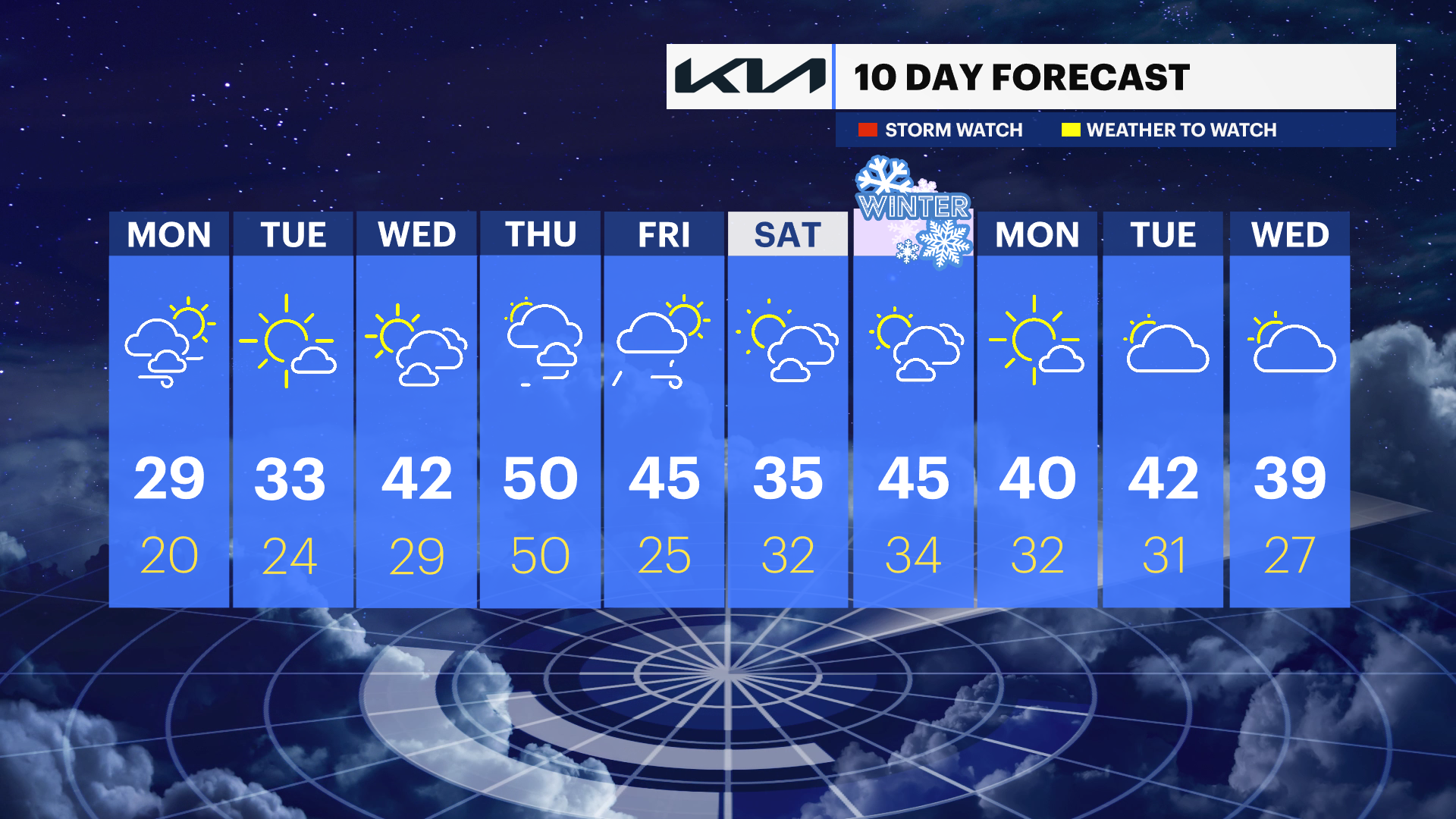 Cold to start, with temperatures rising throughout the day. Mostly cloudy during the day, then rain showers arrive in the evening. Afternoon temperatures in the 40s rising into the upper 40s by midnight.