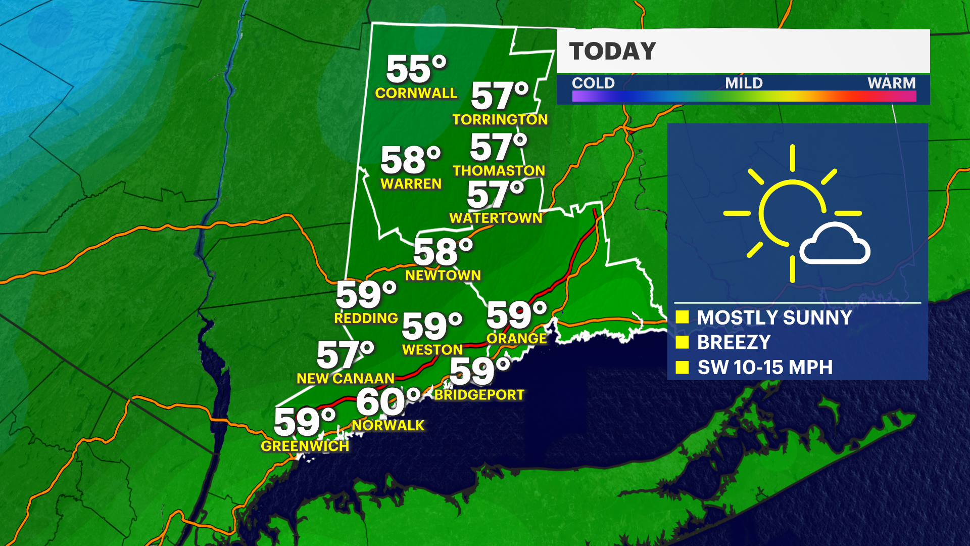 Today: Mostly Sunny and less windy. Highs near 60 degrees.