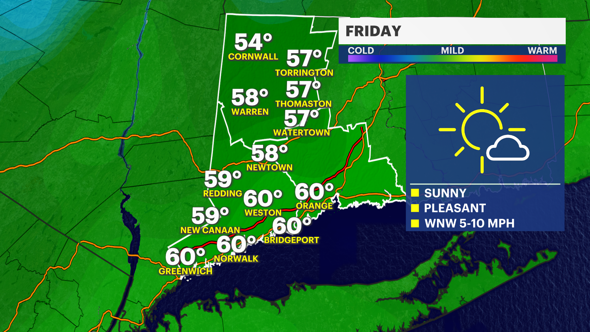 Friday: Mostly sunny and pleasant. Highs near 60 degrees.