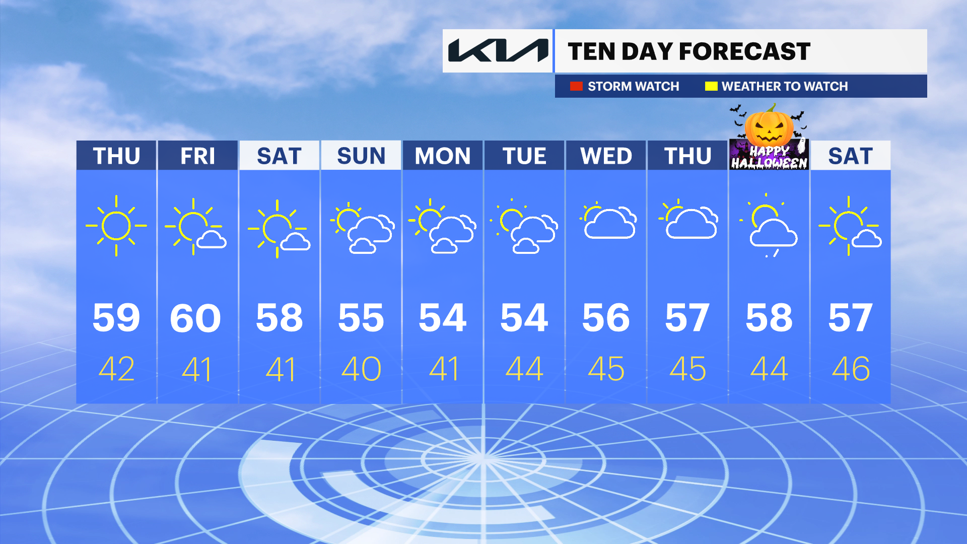 Next Week: Temperatures remain cooler than average. Rain is expected Wednesday and Thursday and could linger on Halloween next Friday.