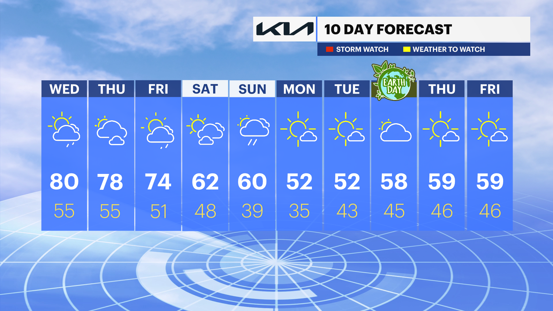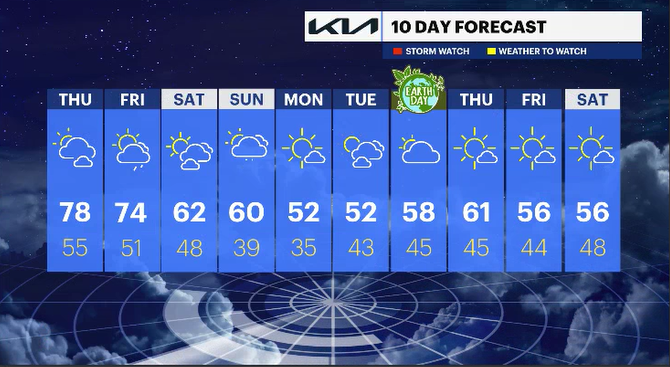 Speaking of Thursday, we’re looking at partly sunny skies and another warm day on tap. High temperatures will once again reach into the 70s and 80s, keeping that above-average warmth in place. As we head into Friday, we’ll hold onto partly sunny conditions, but there will be the chance for some late-day showers. Highs will ease back slightly, topping out in the 60s to low 70s.