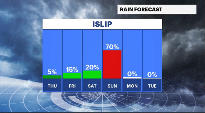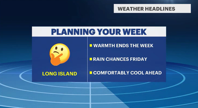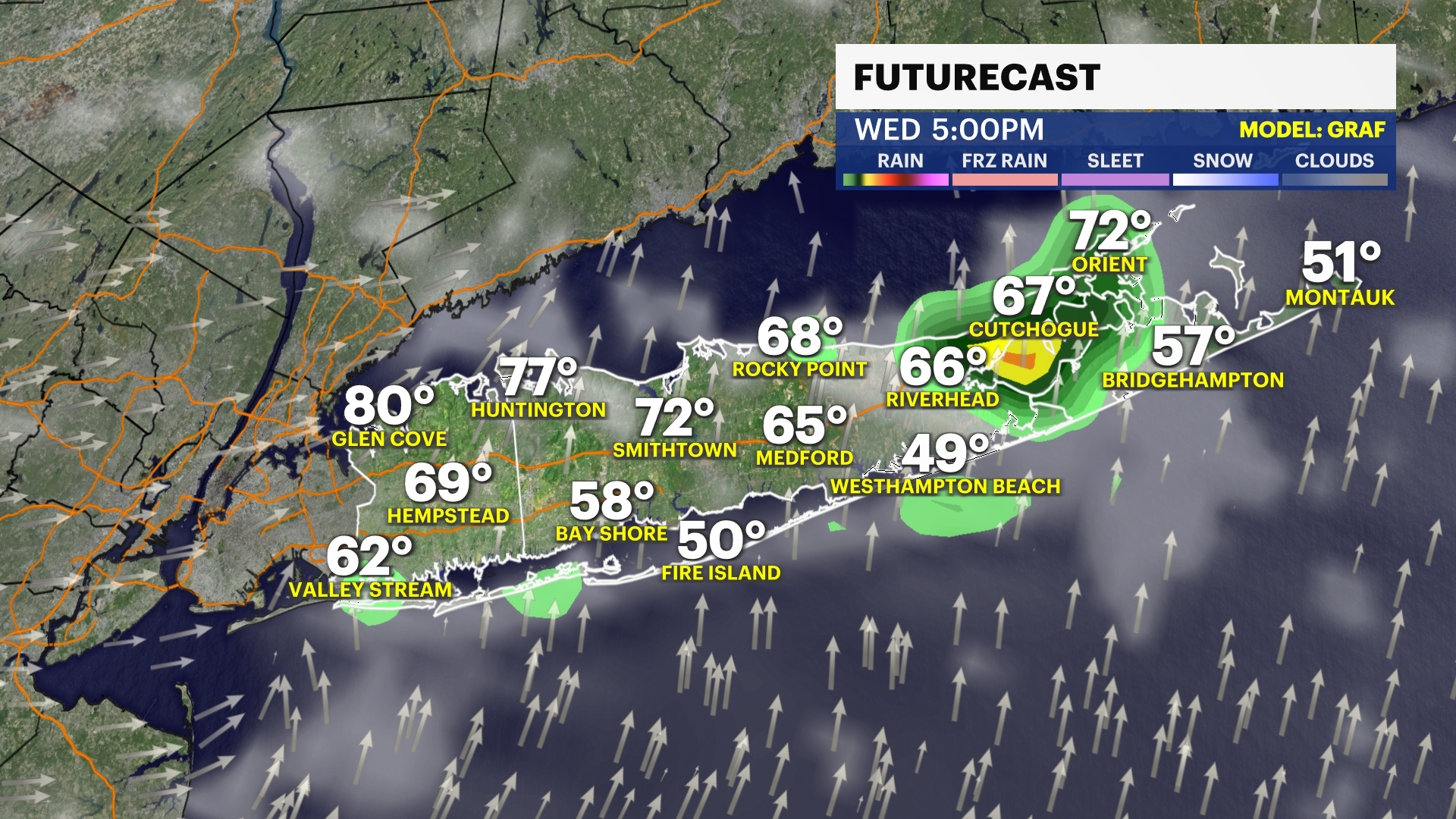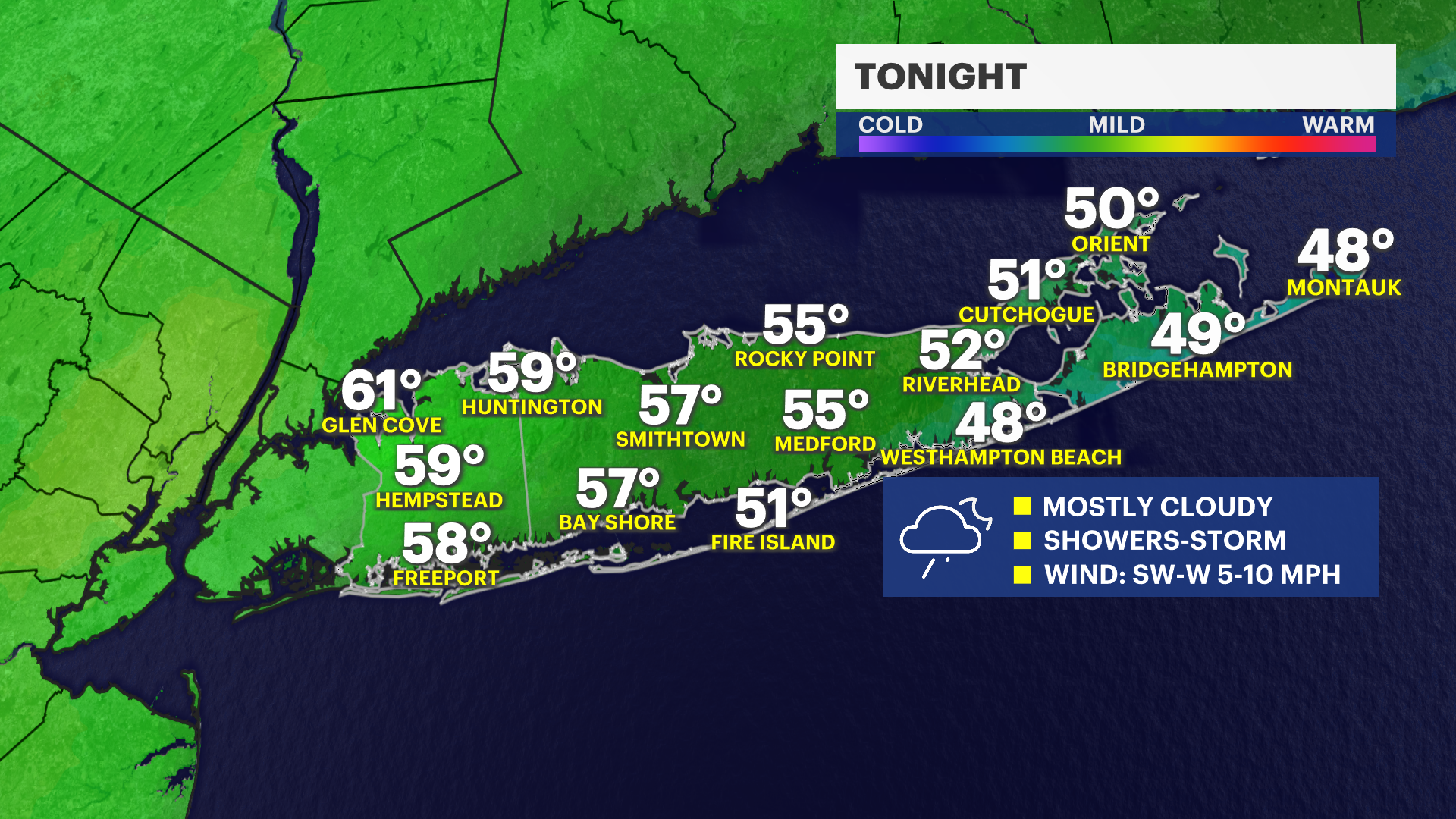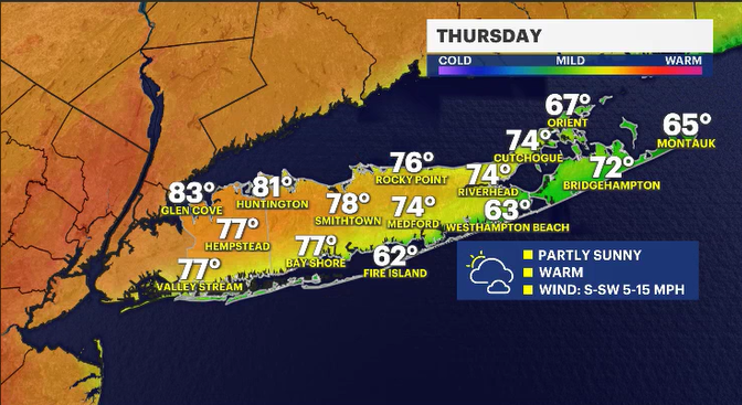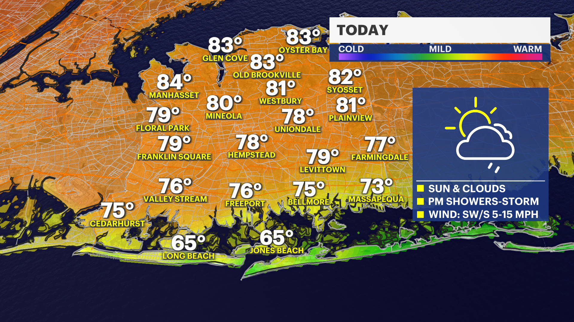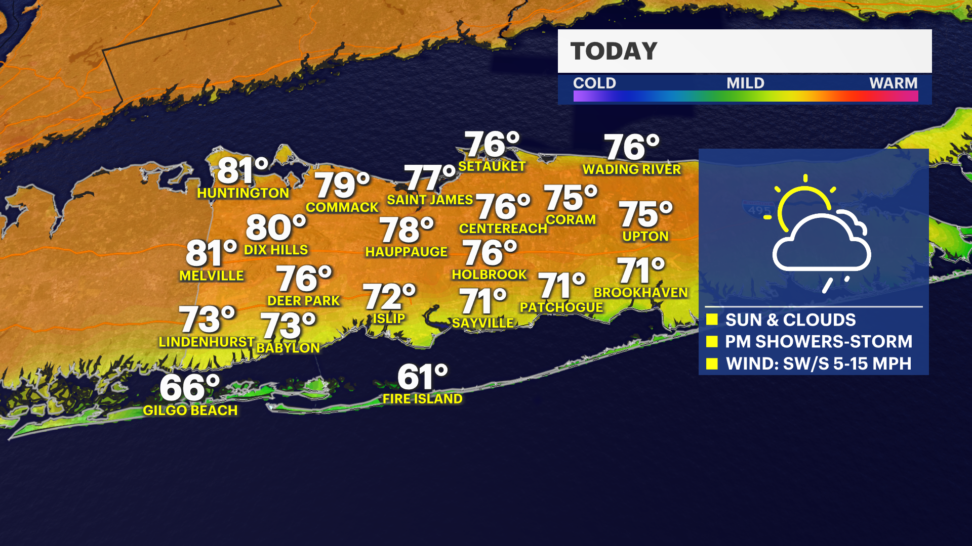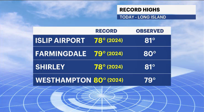 We’re starting off today with mostly sunny skies, giving way to a mixture of sun and clouds as we head through the afternoon. It’s going to be a warm day — potentially record-setting — with highs climbing into the 70s and even low 80s in spots. The record high at Long Island MacArthur Airport is 78 degrees, set back in 2024, and we’ll be right in that range. Do keep an eye to the sky later on, though, as a few late-day showers or even a thunderstorm could pop up.