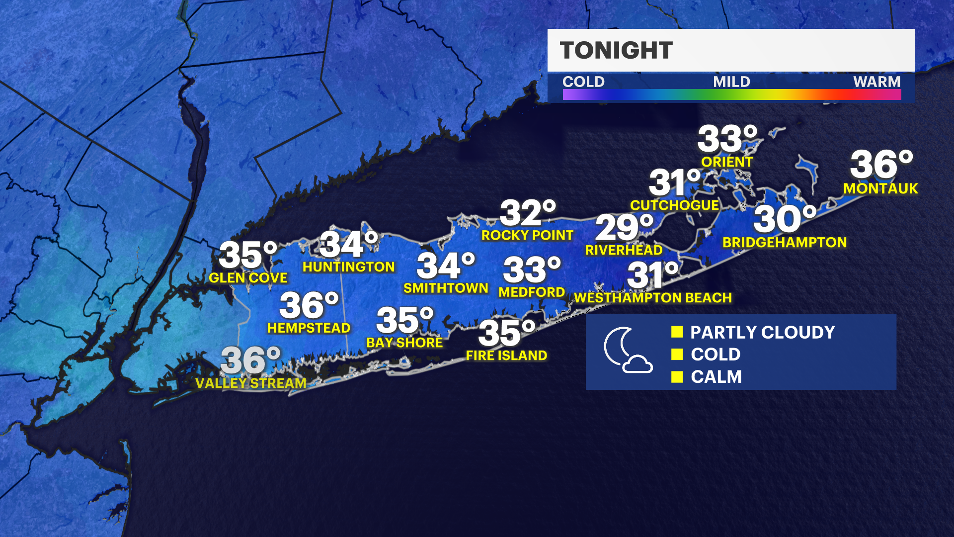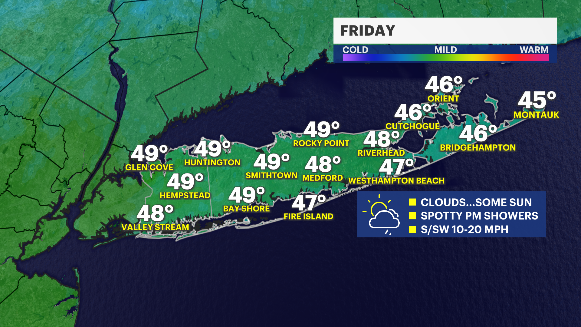 Today: Sunny breaks this morning giving way to a cloudy sky this afternoon. Spotty rain showers developing after 3 p.m. High near 52, 40s East End and shorelines. South-southeast winds 10 to 20 mph.