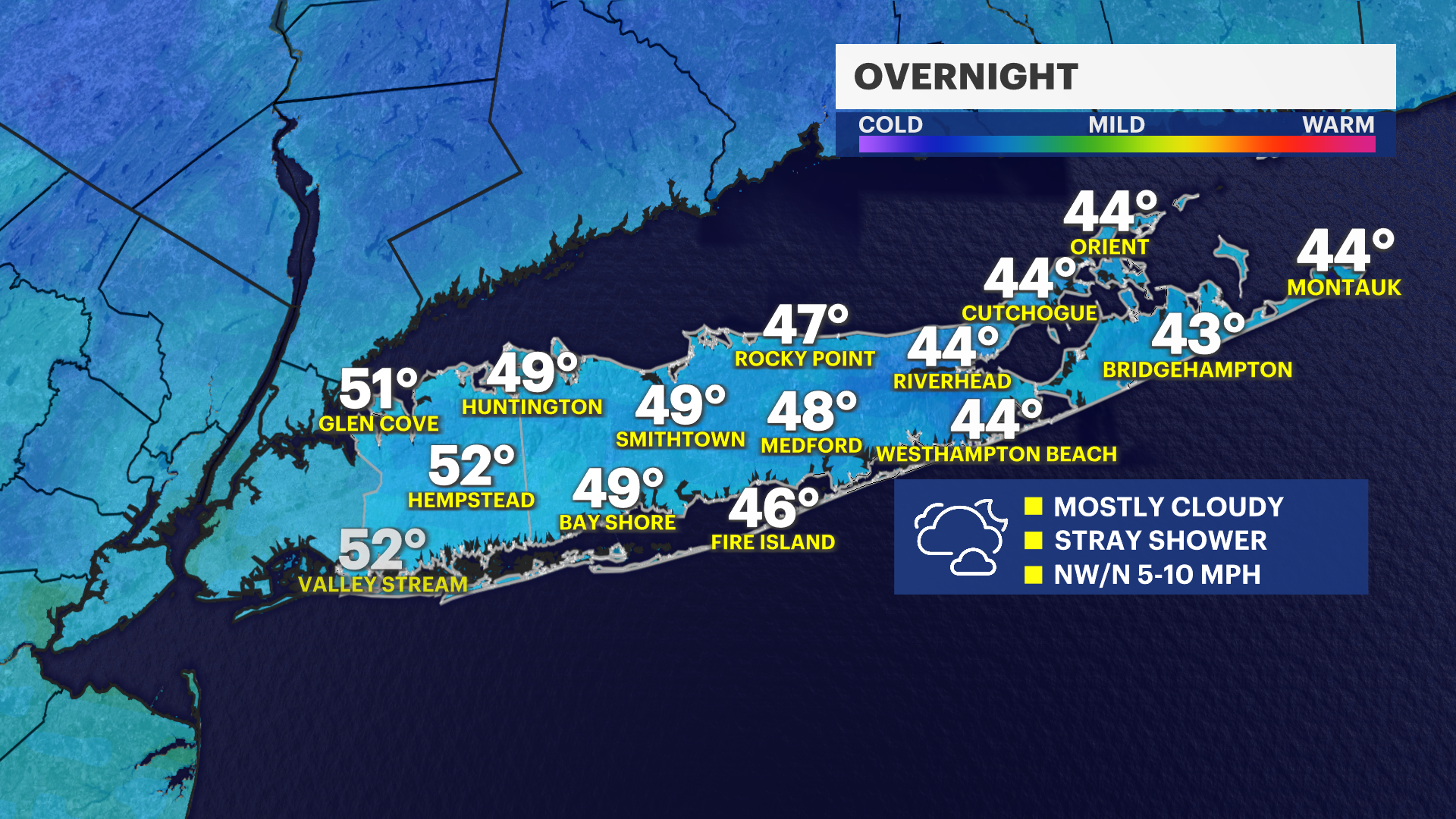 Mostly cloudy and cool, with low temperatures in the 40s to low 50s into early Friday morning. There is also a slight chance of a passing shower or two, so you may want to keep an umbrella with you.