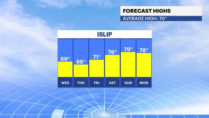 Highs in the low 70s and lows near 50 degrees, before potentially warming up to near 80 degrees on Sunday.