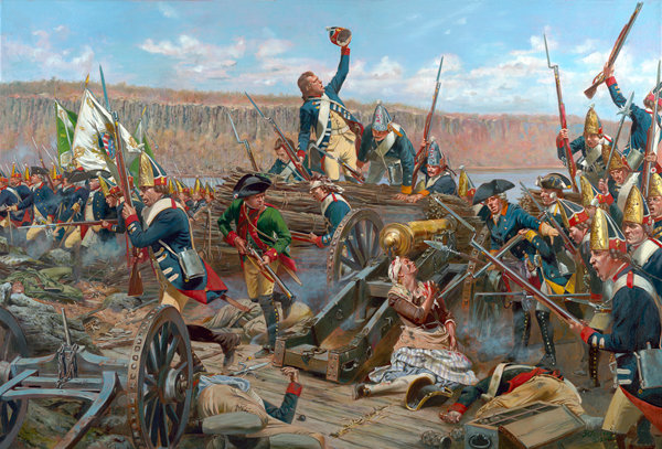 A depiction of Margaret Corbin taking over her husband's cannon during the Battle of Fort Washington in 1776, painted by Don Troiani.