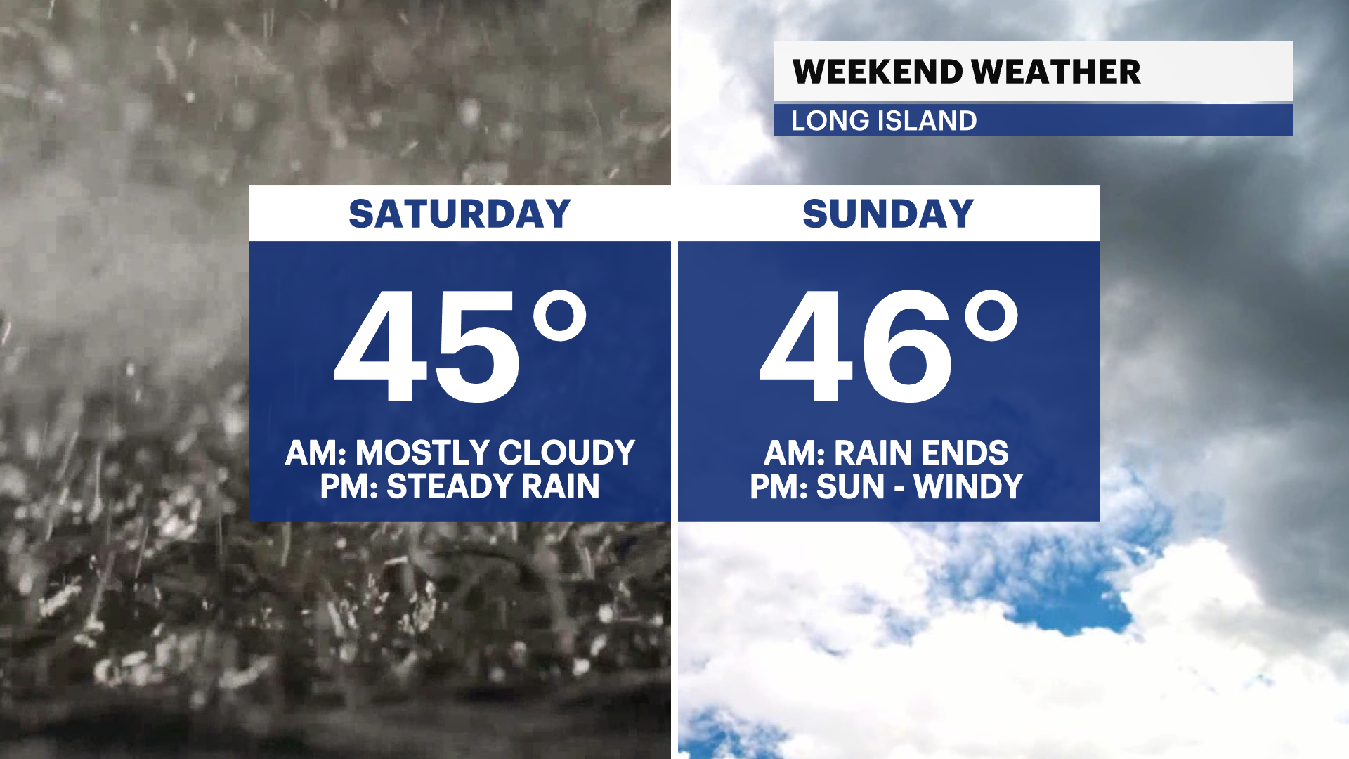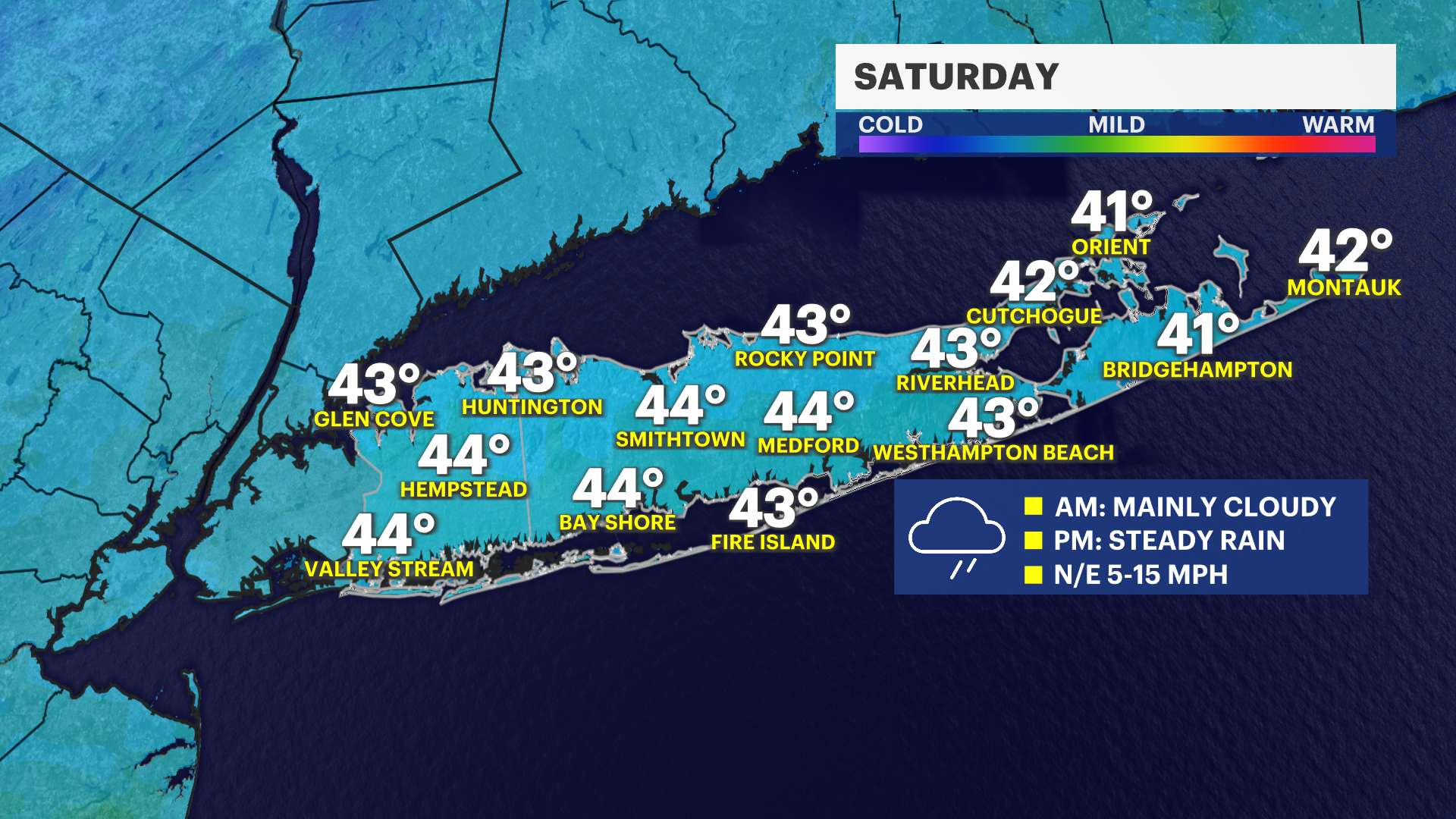 Saturday starts dry! If you still have holiday decorations to take down, you can still get that done in the morning under a mostly cloudy sky. Temperatures will be in the low to middle 40s Saturday afternoon with rain developing, especially after 2 p.m. Once the rain moves in, expect a steady and moderate, chilly rain through the rest of Saturday. While flooding is not expected, roads will be wet with puddles around. Drive with caution. Thankfully, there will not be too much wind with this. Around 1 inch of rain will fall which is beneficial for Long Island right now due to a moderate drought continuing for parts of Nassau and Suffolk Counties.