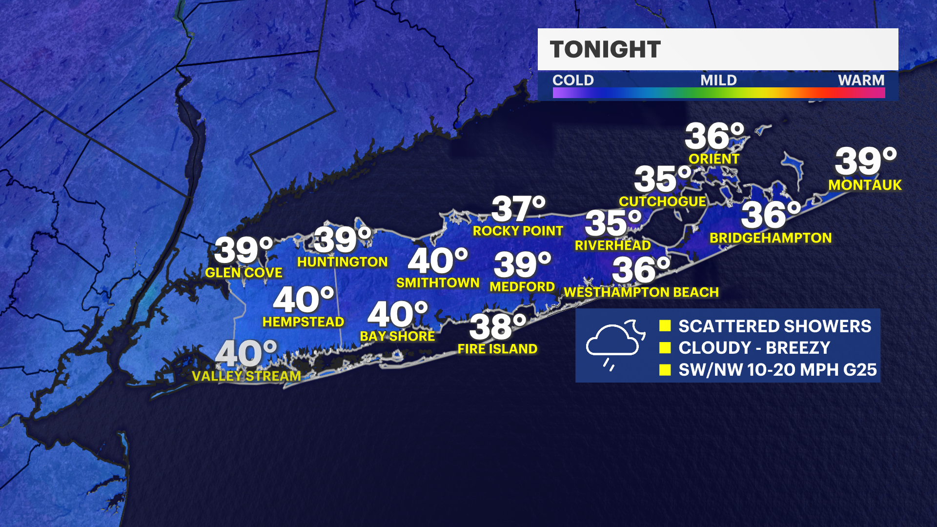 Tonight, it will be breezy with scattered light to moderate rain showers off and on through around 10 p.m. Overnight temperatures will start off in the upper 40s and then drop down to around 40 degrees by daybreak on Saturday.