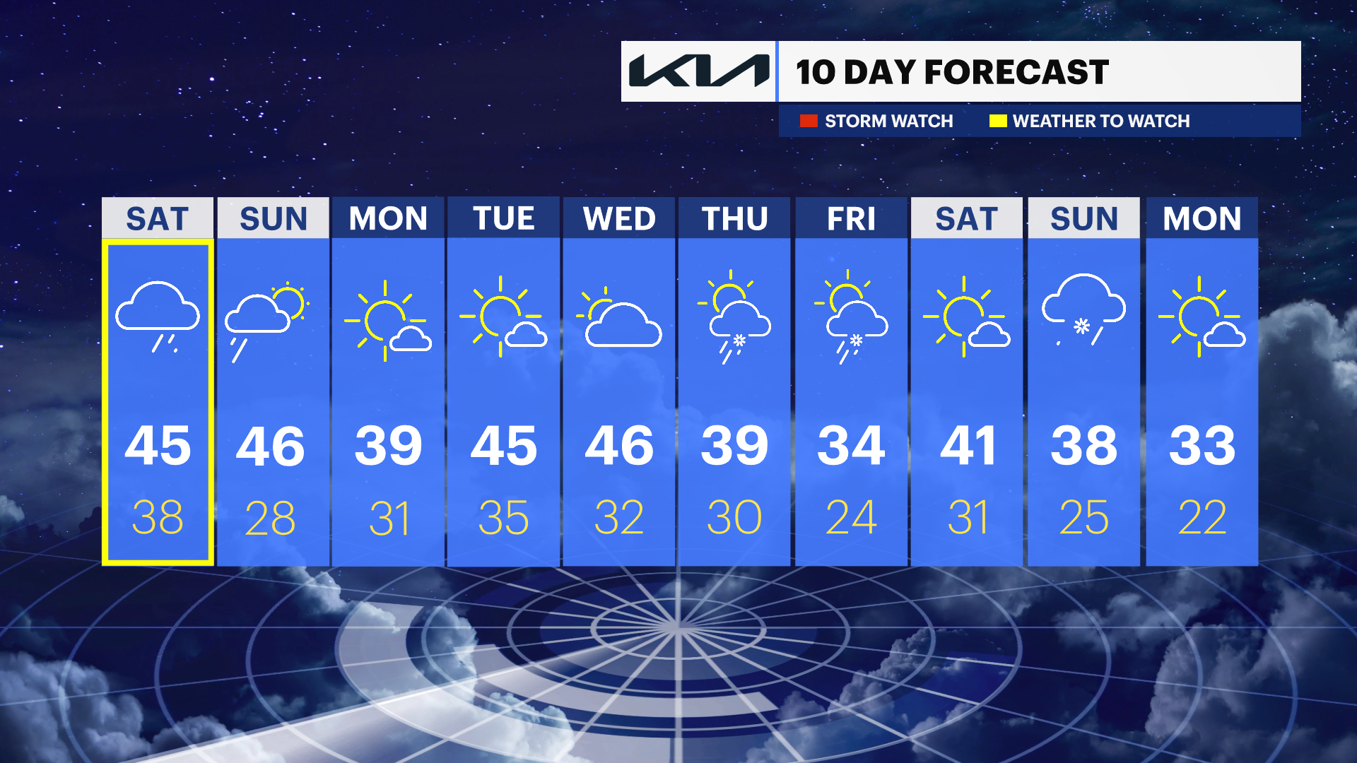 The rain ends Sunday morning with breaks of sun developing, but it becomes windy Sunday afternoon and evening with some gusts between 30 and 40 mph. Monday will be colder with highs in the upper 30s, but sunny. Tuesday and Wednesday also look dry with high temperatures back in the 40s.
