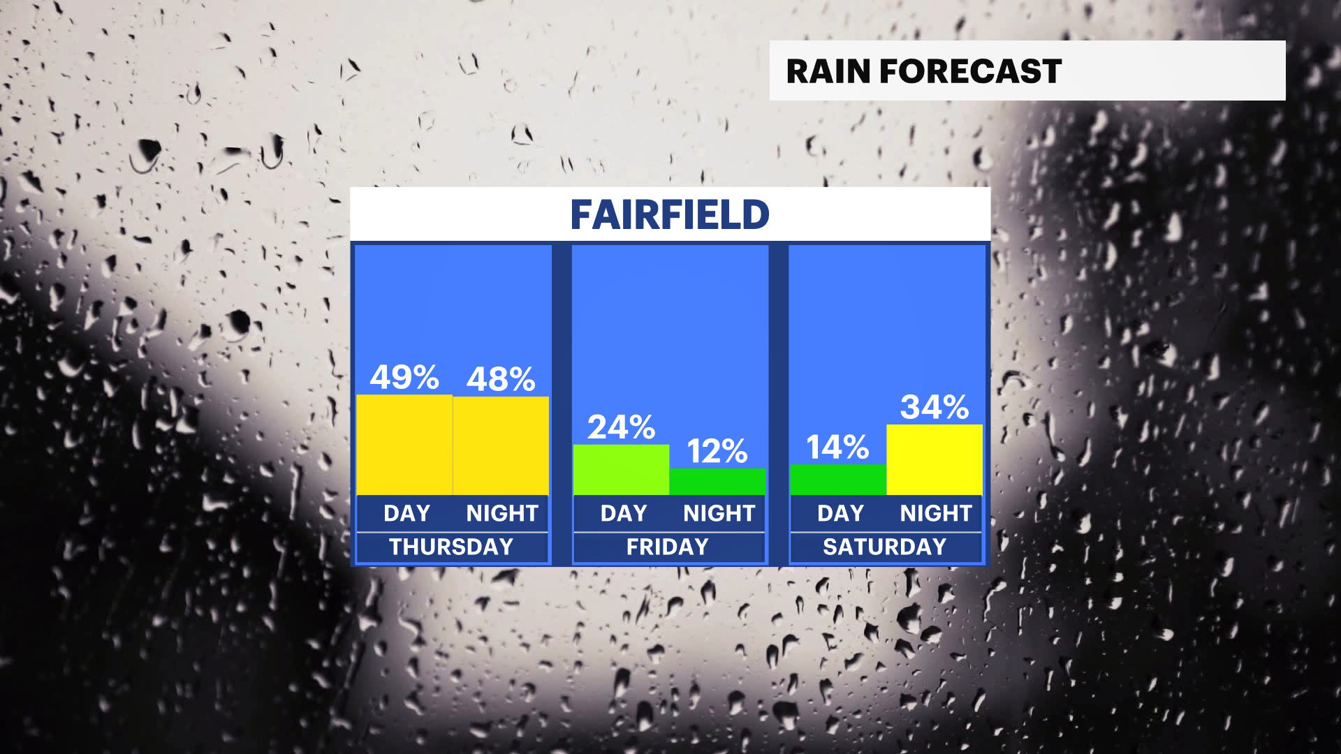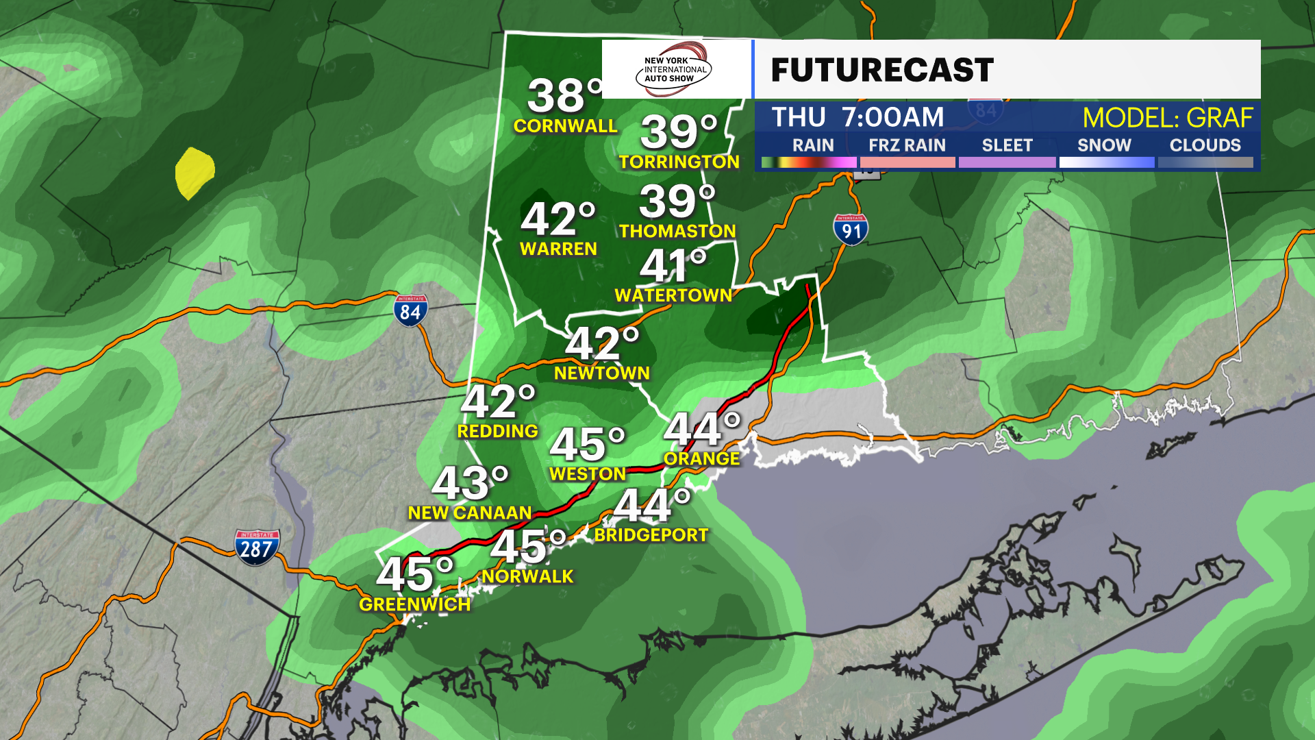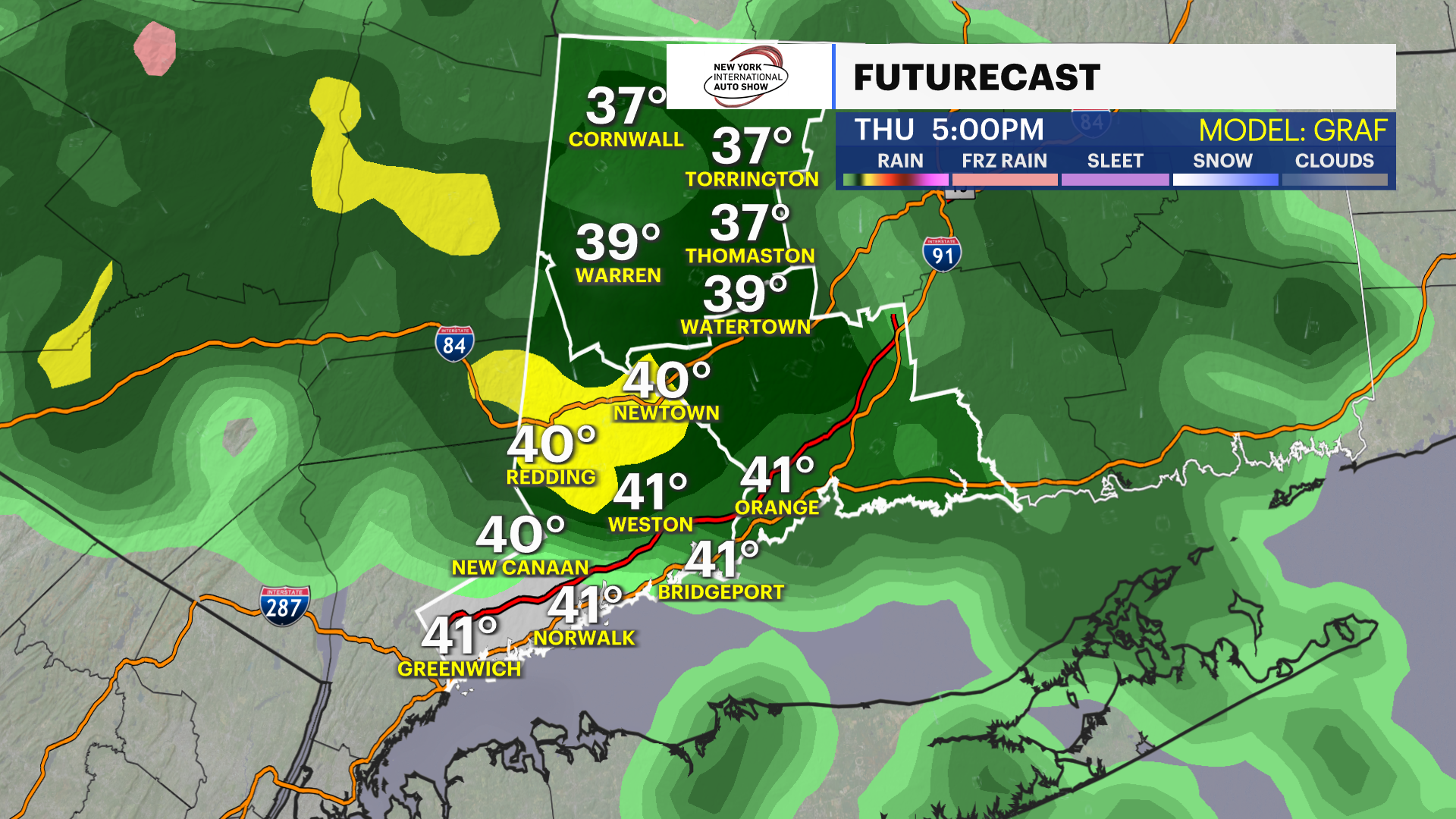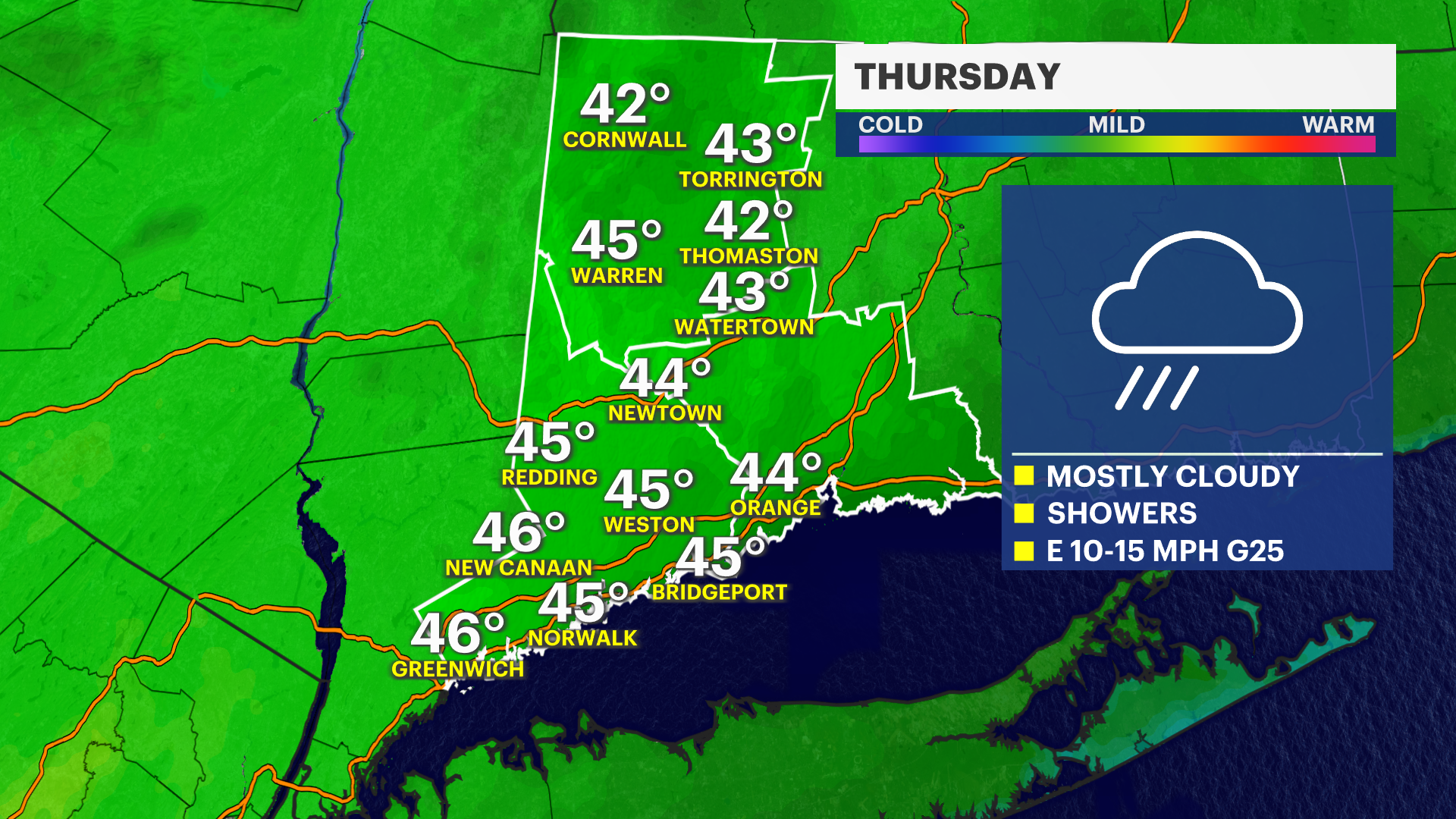 A cold front is now on its way into western Connecticut tonight. Scattered showers and even a few rumbles of thunder are possible in some of the heavier downpours. The rain will be on and off, but eventually, the winds will turn more onshore as the cold front sinks through the area. This new colder air mass will wipe out the warm 60-and 70-degree temperatures we've had the last few days.