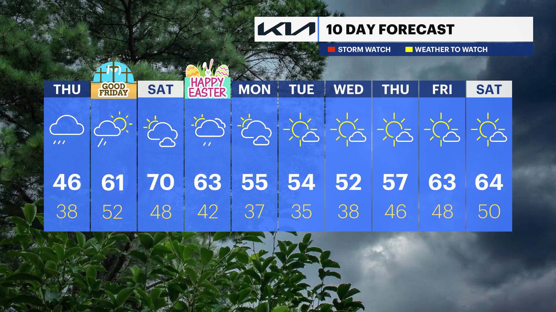 The front will rise back northward on Friday. The warmer air will push northward and temperatures will rise into the lower 60s. Saturday looks to be the warmest day of the weekend with temperatures pushing 70 degrees once again.