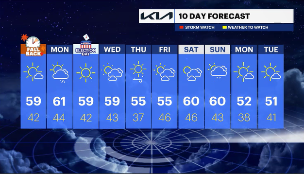 TUESDAY (ELECTION DAY): Mostly sunny, quiet day. Highs in the upper 50s. Lows in the low 40s.