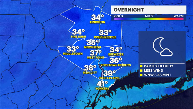 OVERNIGHT: Partly cloudy, less windy, chilly. Lows in the low 40s.