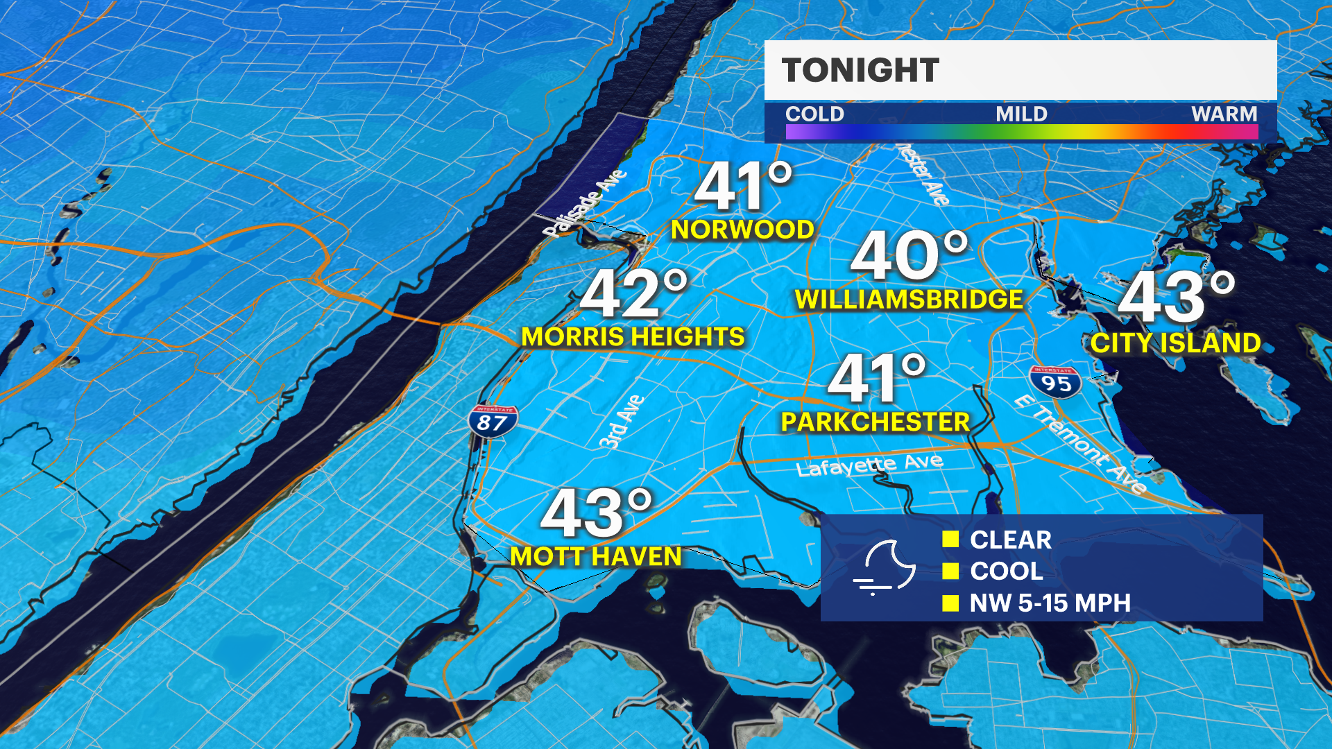 Enjoy the seasonal and mild weather across the Bronx and Brooklyn through Sunday. While the temperatures are pleasant, stay alert as breezes reaching up to 25 mph have triggered an elevated fire risk for local parks and brush areas. Please be extremely cautious with any open flames. If you're heading out to the botanical gardens or the boardwalk early Sunday morning, prepare for one last chilly snap as temperatures drop into the 30s or near 40.