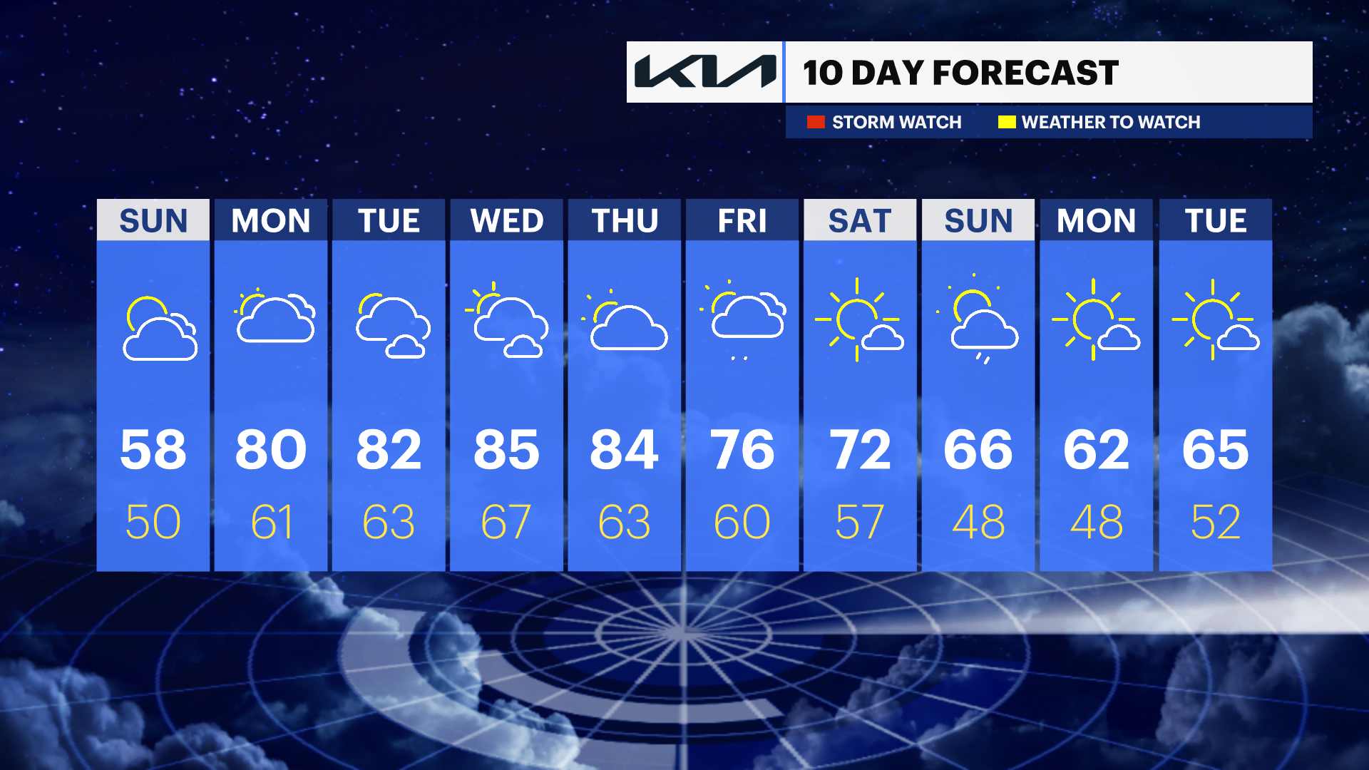 MONDAY: Mostly cloudy, with a chance of spotty to scattered showers. Highs in the low 70s. Lows in the upper 50s.