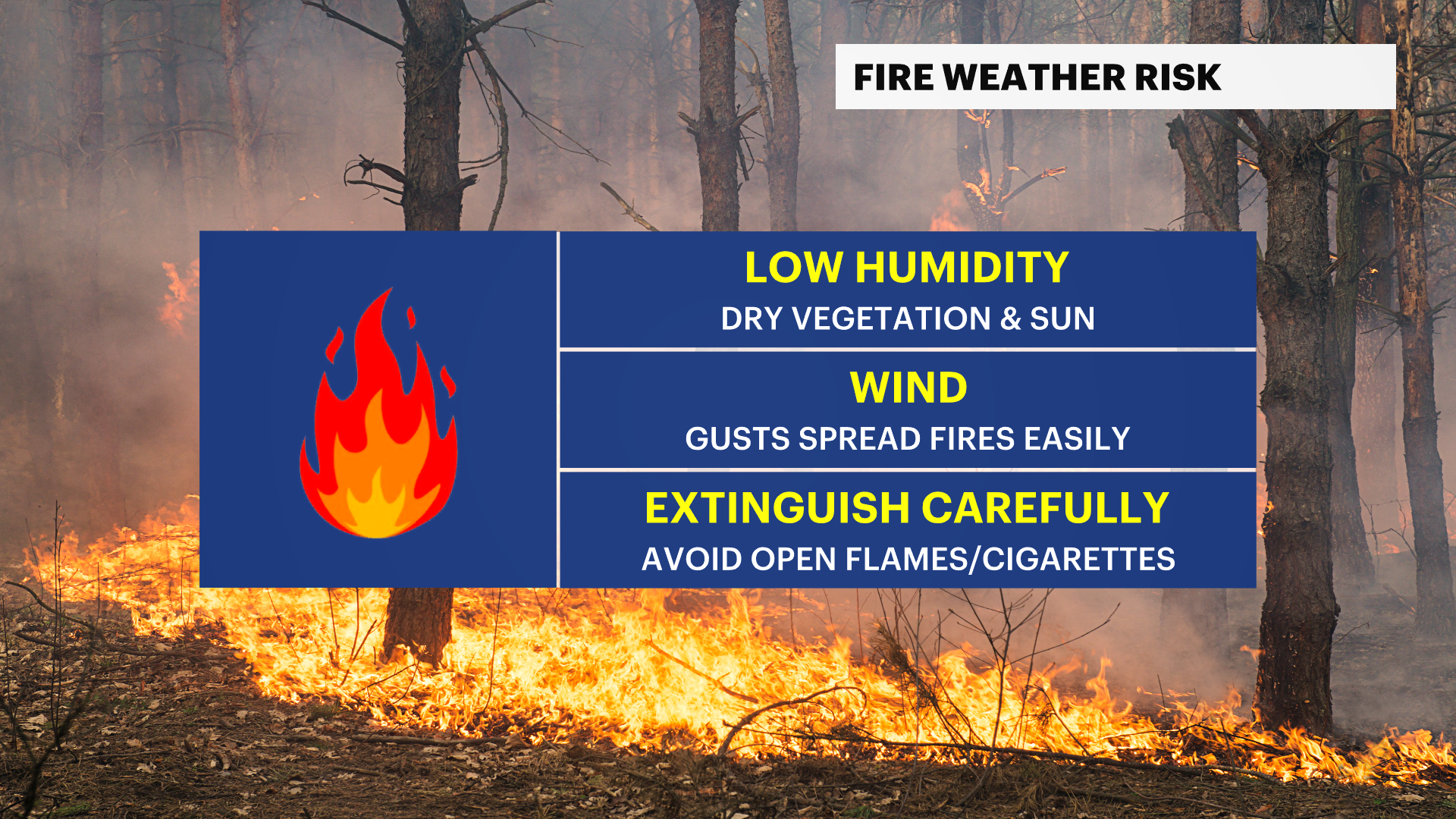 This weekend will be mild and breezy with highs in the upper 50s to mid 60s. There's a potential risk for fire danger on Saturday due to the low humidity, sunshine, mild temperatures and breezy conditions. Keep in mind, fires could spread easily with these conditions so avoid any open flames and discard cigarette buds properly.