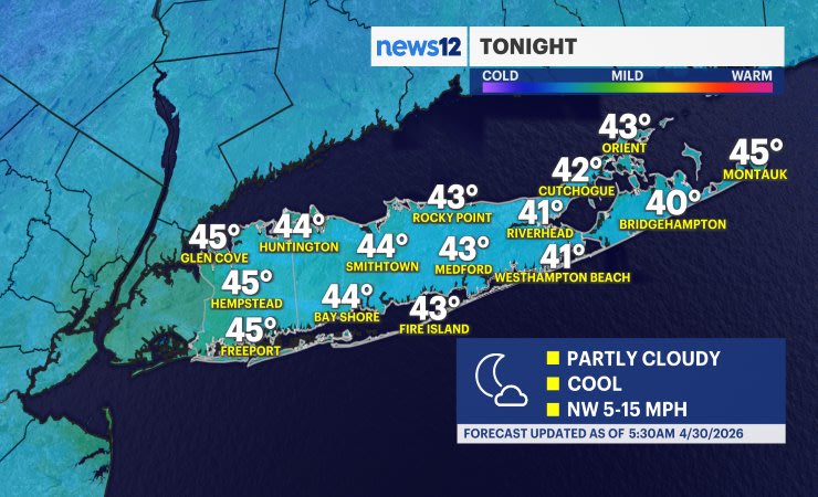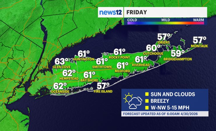 Scattered rain will continue overnight Wednesday night into Thursday morning. Most of Long Island will be drying out from the rain before 10 a.m. with clouds slowly breaking through the afternoon and evening. Around 0.5" of rain on average is still likely, which is beneficial to Nassau and Suffolk counties. The region is still around 2" below average rain for the month. Temperatures on Thursday will get to around 60 again. It will also become breezy with some wind gusts around 15 to 25 mph.