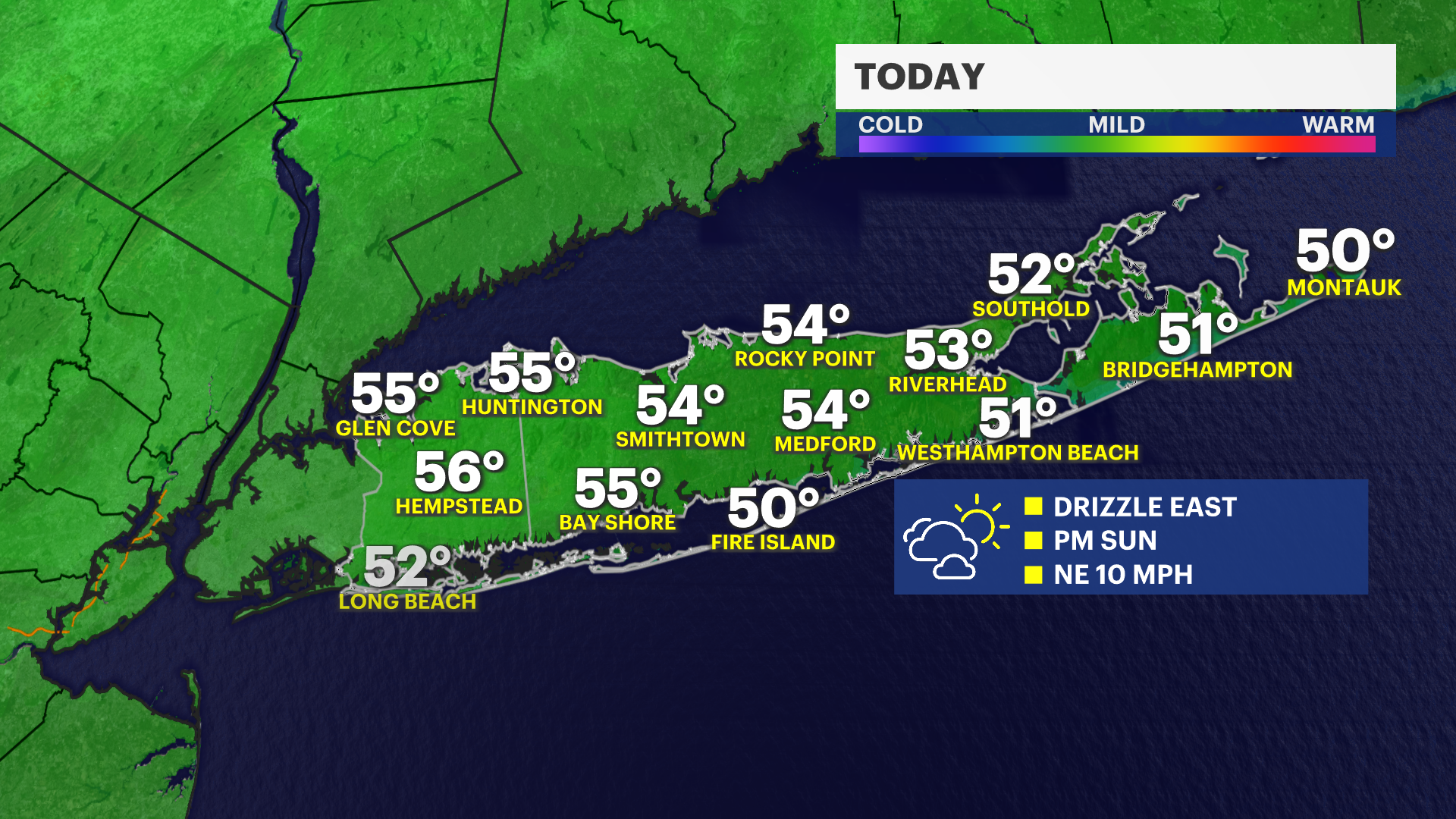 It's a nicer finish to the weekend across the island, but showers and clouds will linger for at least the first half of the afternoon for neighborhoods east of Riverhead. Beautiful weather is in the forecast for Monday and Tuesday, but another storm will bring showers Thursday and a chilly finish to the week (and start to May).