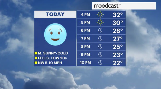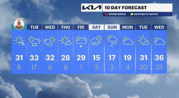 TUESDAY: Mix of sun and clouds. Highs: Low 30s. Lows: Mid-to-upper teens.