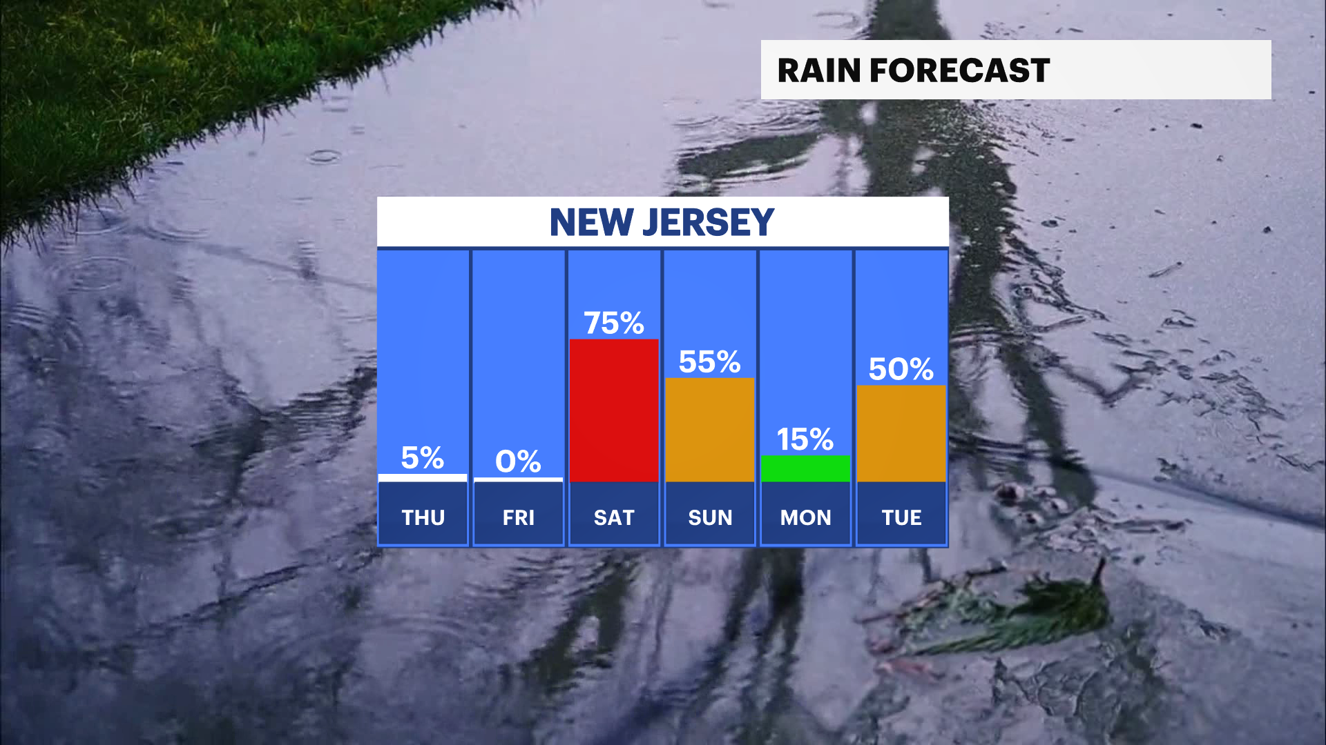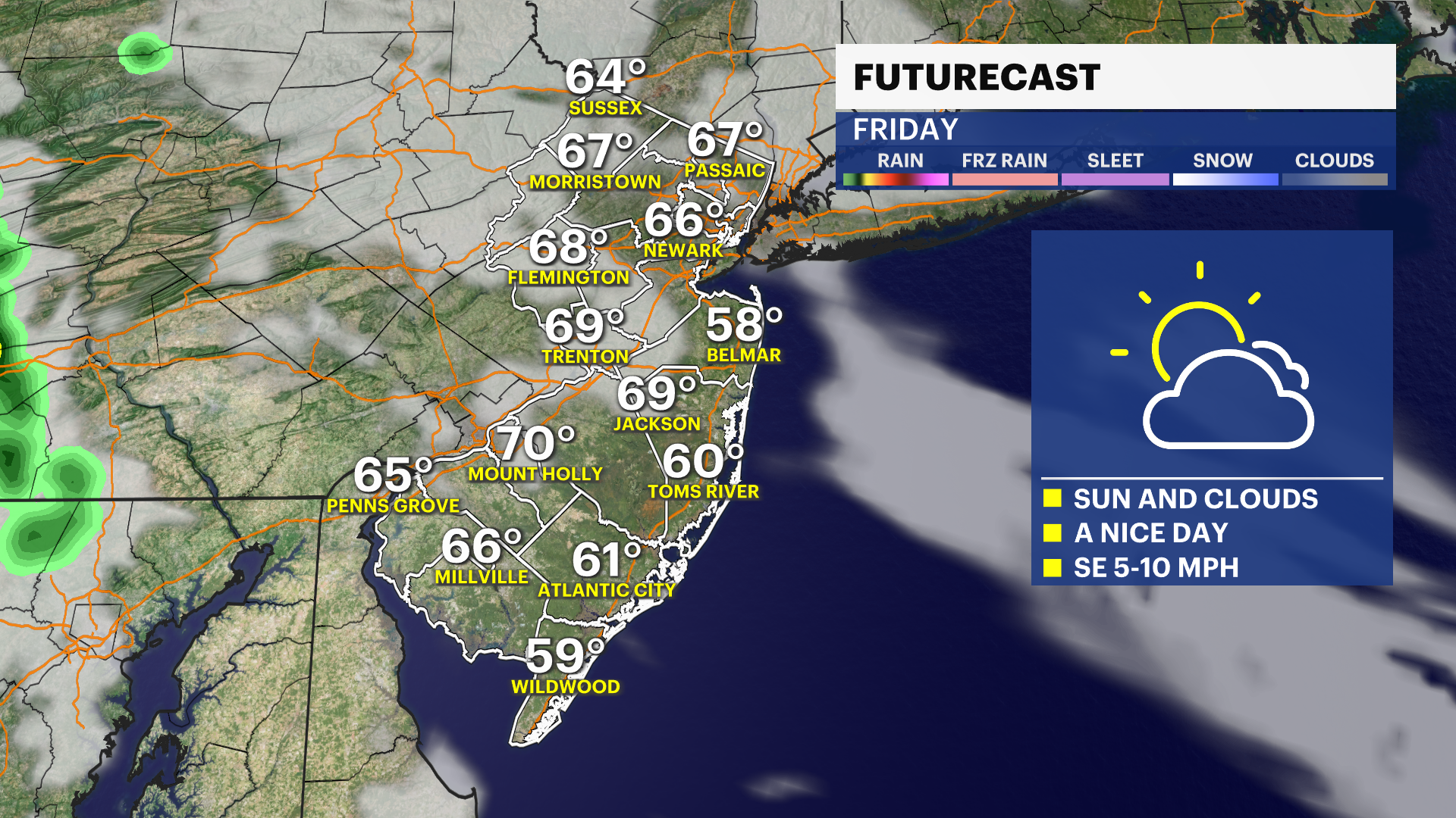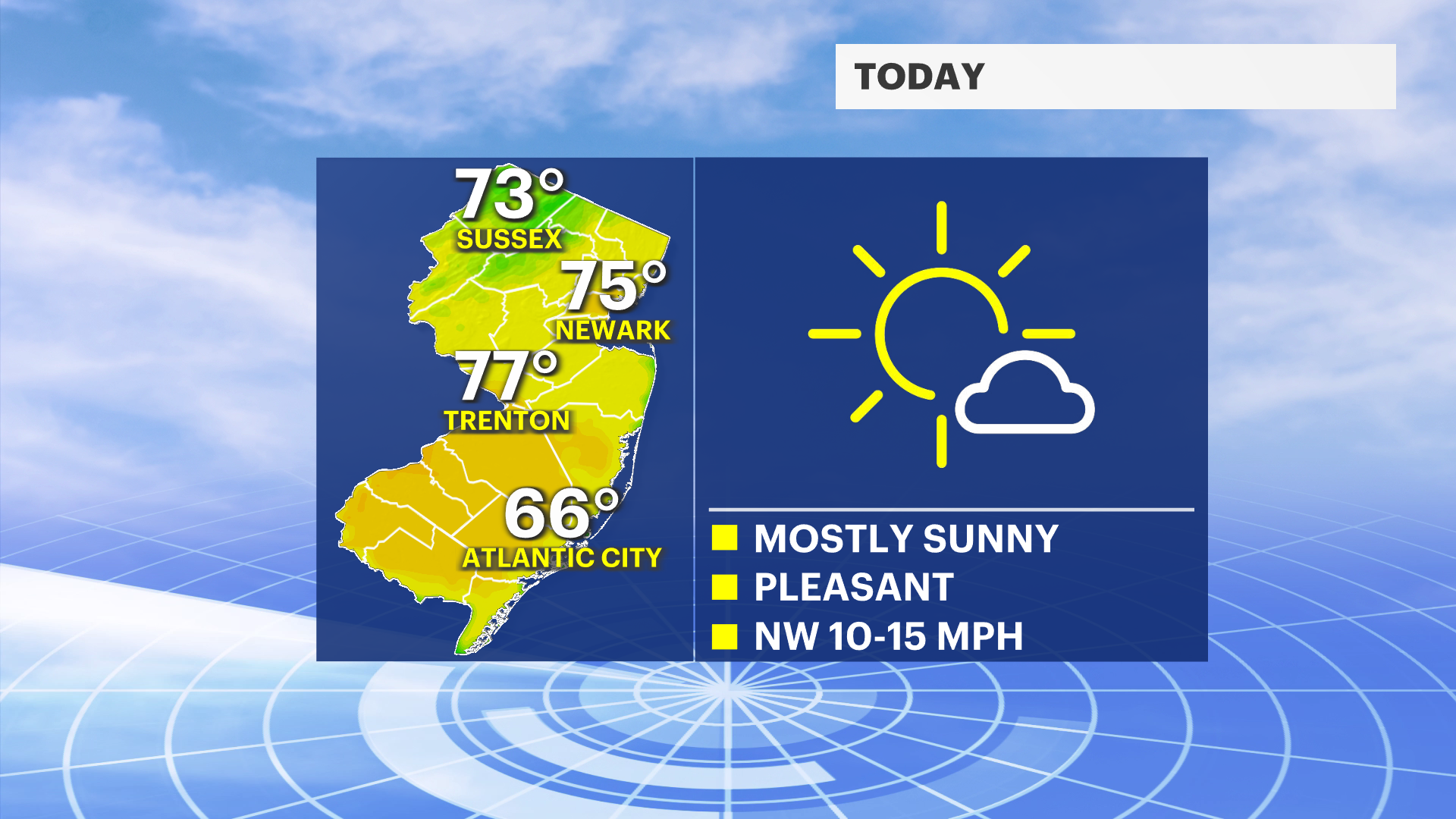 It will be gorgeous today with highs in the lower to mid 70s under a sunny sky. The wind is calm, too. Tonight's low will be back to the upper 40s for most and low 50s in urban NE NJ.